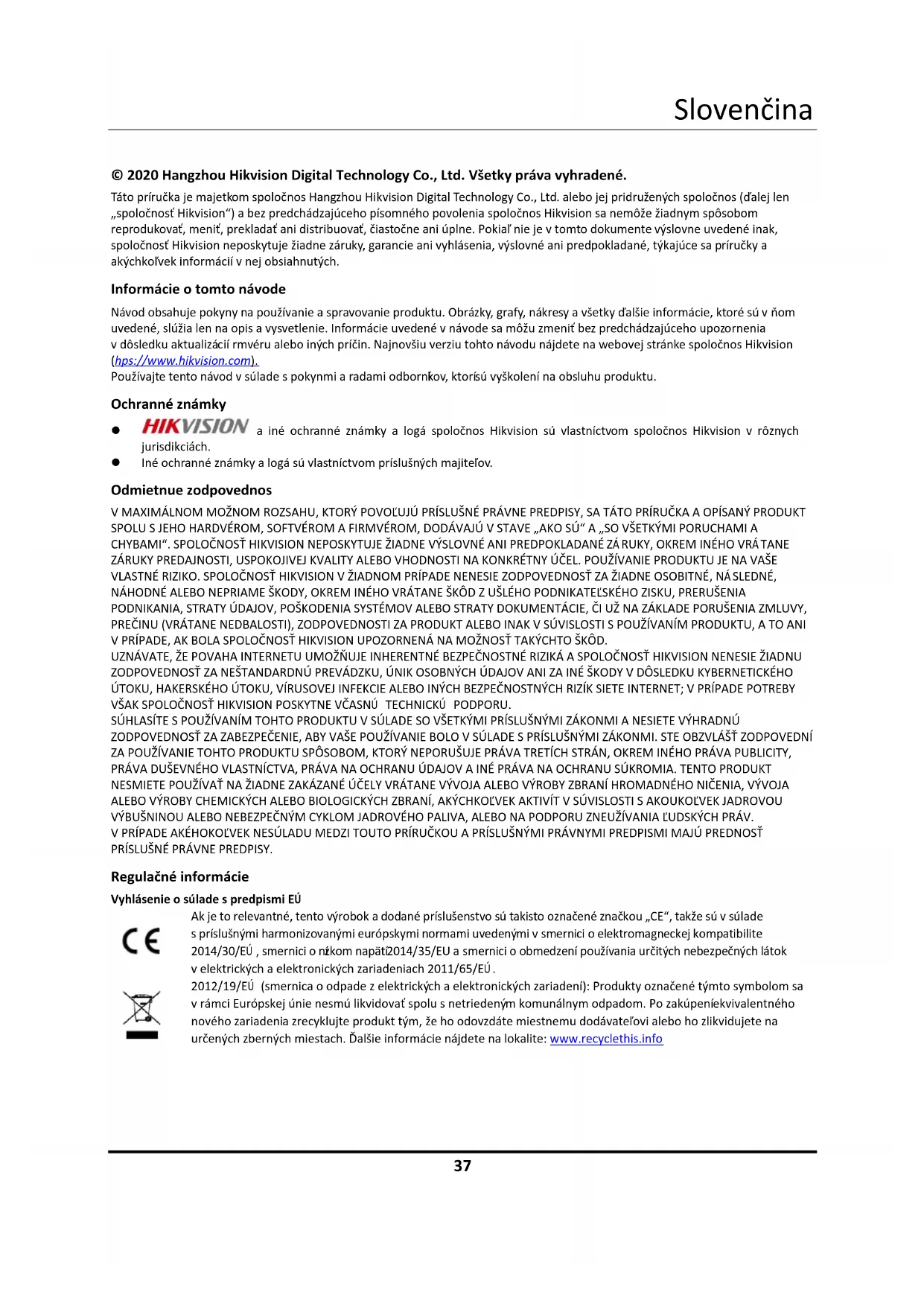 © 2020 Hangzhou Hikvision Digital Technology Co., Ltd. Všetky práva vyhradené. Táto príručka je majetkom spoločnosti Hangzhou Hikvision Digital Technology Co., Ltd. alebo jej pridružených spoločností (ďalej len „spoločnosť Hikvision“) a bez predchádzajúceho písomného povolenia spoločnosti Hikvision sa nemôže žiadnym spôsobom reprodukovať, meniť, prekladať ani distribuovať, čiastočne ani úplne. Pokiaľ nie je v tomto dokumente výslovne uvedené inak, spoločnosť Hikvision neposkytuje žiadne záruky, garancie ani vyhlásenia, výslovné ani predpokladané, týkajúce sa príručky a akýchkoľvek informácií v nej obsiahnutých. Informácie o tomto návode Návod obsahuje pokyny na používanie a spravovanie produktu. Obrázky, grafy, nákresy a všetky ďalšie informácie, ktoré sú v ňom uvedené, slúžia len na opis a vysvetlenie. Informácie uvedené v návode sa môžu zmeniť bez predchádzajúceho upozornenia v dôsledku aktualizácií firmvéru alebo iných príčin. Najnovšiu verziu tohto návodu nájdete na webovej stránke spoločnosti Hikvision (https://www.hikvision.com). Používajte tento návod v súlade s pokynmi a radami odborníkov, ktorí sú vyškolení na obsluhu produktu. Ochranné známky a iné ochranné známky a logá spoločnosti Hikvision sú vlastníctvom spoločnosti Hikvision v rôznych jurisdikciách. Iné ochranné známky a logá sú vlastníctvom príslušných majiteľov. Odmietnutie zodpovednosti V MAXIMÁLNOM MOŽNOM ROZSAHU, KTORÝ POVOĽUJÚ PRÍSLUŠNÉ PRÁVNE PREDPISY, SA TÁTO PRÍRUČKA A OPÍSANÝ PRODUKT SPOLU S JEHO HARDVÉROM, SOFTVÉROM A FIRMVÉROM, DODÁVAJÚ V STAVE „AKO SÚ“ A „SO VŠETKÝMI PORUCHAMI A CHYBAMI“. SPOLOČNOSŤ HIKVISION NEPOSKYTUJE ŽIADNE VÝSLOVNÉ ANI PREDPOKLADANÉ ZÁRUKY, OKREM INÉHO VRÁTANE ZÁRUKY PREDAJNOSTI, USPOKOJIVEJ KVALITY ALEBO VHODNOSTI NA KONKRÉTNY ÚČEL. POUŽÍVANIE PRODUKTU JE NA VAŠE VLASTNÉ RIZIKO. SPOLOČNOSŤ HIKVISION V ŽIADNOM PRÍPADE NENESIE ZODPOVEDNOSŤ ZA ŽIADNE OSOBITNÉ, NÁSLEDNÉ, NÁHODNÉ ALEBO NEPRIAME ŠKODY, OKREM INÉHO VRÁTANE ŠKÔD Z UŠLÉHO PODNIKATEĽSKÉHO ZISKU, PRERUŠENIA PODNIKANIA, STRATY ÚDAJOV, POŠKODENIA SYSTÉMOV ALEBO STRATY DOKUMENTÁCIE, ČI UŽ NA ZÁKLADE PORUŠENIA ZMLUVY, PREČINU (VRÁTANE NEDBALOSTI), ZODPOVEDNOSTI ZA PRODUKT ALEBO INAK V SÚVISLOSTI S POUŽÍVANÍM PRODUKTU, A TO ANI V PRÍPADE, AK BOLA SPOLOČNOSŤ HIKVISION UPOZORNENÁ NA MOŽNOSŤ TAKÝCHTO ŠKÔD. UZNÁVATE, ŽE POVAHA INTERNETU UMOŽŇUJE INHERENTNÉ BEZPEČNOSTNÉ RIZIKÁ A SPOLOČNOSŤ HIKVISION NENESIE ŽIADNU ZODPOVEDNOSŤ ZA NEŠTANDARDNÚ PREVÁDZKU, ÚNIK OSOBNÝCH ÚDAJOV ANI ZA INÉ ŠKODY V DÔSLEDKU KYBERNETICKÉHO ÚTOKU, HAKERSKÉHO ÚTOKU, VÍRUSOVEJ INFEKCIE ALEBO INÝCH BEZPEČNOSTNÝCH RIZÍK SIETE INTERNET; V PRÍPADE POTREBY VŠAK SPOLOČNOSŤ HIKVISION POSKYTNE VČASNÚ TECHNICKÚ PODPORU. SÚHLASÍTE S POUŽÍVANÍM TOHTO PRODUKTU V SÚLADE SO VŠETKÝMI PRÍSLUŠNÝMI ZÁKONMI A NESIETE VÝHRADNÚ ZODPOVEDNOSŤ ZA ZABEZPEČENIE, ABY VAŠE POUŽÍVANIE BOLO V SÚLADE S PRÍSLUŠNÝMI ZÁKONMI. STE OBZVLÁŠŤ ZODPOVEDNÍ ZA POUŽÍVANIE TOHTO PRODUKTU SPÔSOBOM, KTORÝ NEPORUŠUJE PRÁVA TRETÍCH STRÁN, OKREM INÉHO PRÁVA PUBLICITY, PRÁVA DUŠEVNÉHO VLASTNÍCTVA, PRÁVA NA OCHRANU ÚDAJOV A INÉ PRÁVA NA OCHRANU SÚKROMIA. TENTO PRODUKT NESMIETE POUŽÍVAŤ NA ŽIADNE ZAKÁZANÉ ÚČELY VRÁTANE VÝVOJA ALEBO VÝROBY ZBRANÍ HROMADNÉHO NIČENIA, VÝVOJA ALEBO VÝROBY CHEMICKÝCH ALEBO BIOLOGICKÝCH ZBRANÍ, AKÝCHKOĽVEK AKTIVÍT V SÚVISLOSTI S AKOUKOĽVEK JADROVOU VÝBUŠNINOU ALEBO NEBEZPEČNÝM CYKLOM JADROVÉHO PALIVA, ALEBO NA PODPORU ZNEUŽÍVANIA ĽUDSKÝCH PRÁV. V PRÍPADE AKÉHOKOĽVEK NESÚLADU MEDZI TOUTO PRÍRUČKOU A PRÍSLUŠNÝMI PRÁVNYMI PREDPISMI MAJÚ PREDNOSŤ PRÍSLUŠNÉ PRÁVNE PREDPISY. Regulačné informácie Vyhlásenie o súlade s predpismi EÚ