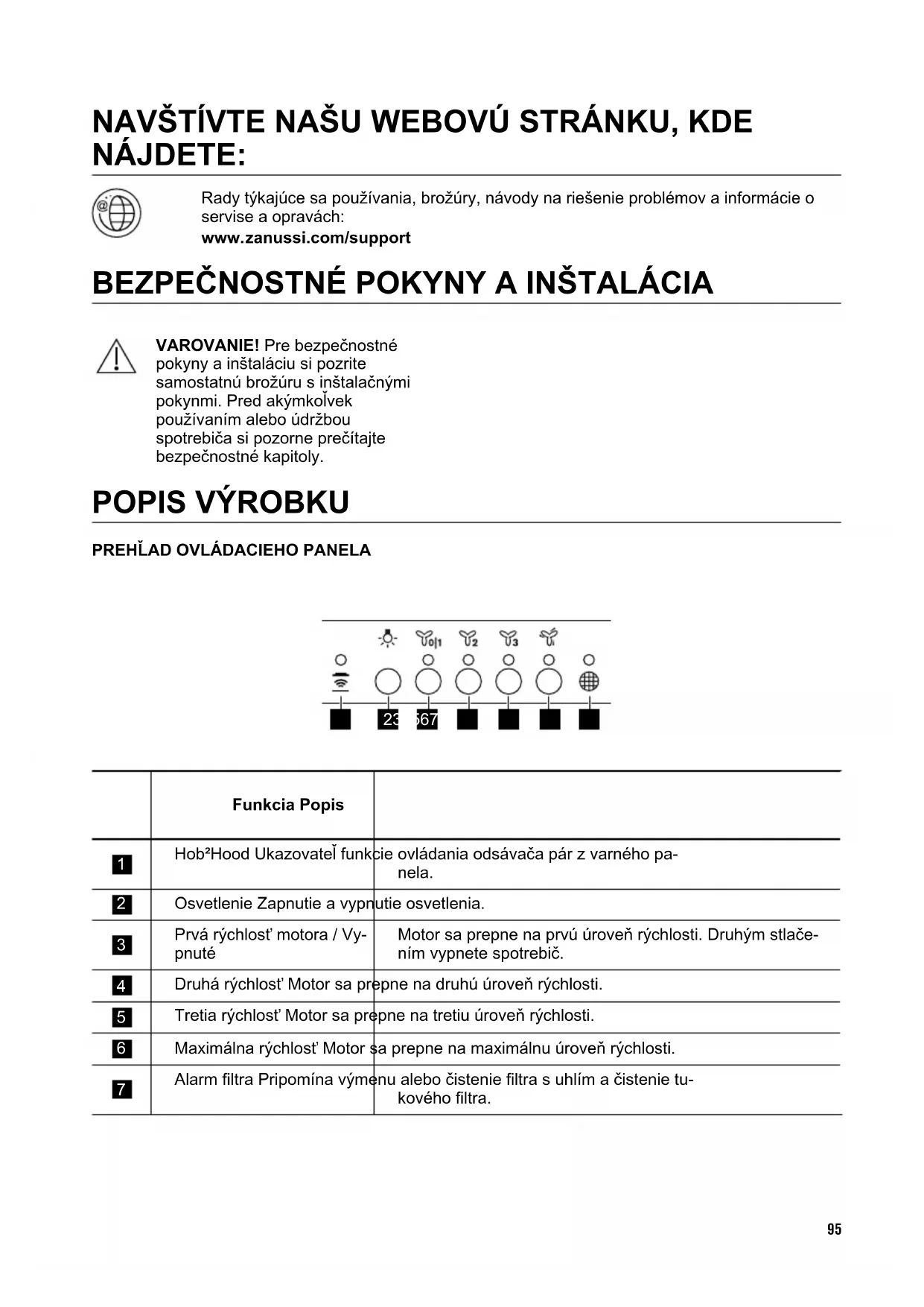 Прибор следует доставить в место раздельного накопления и сбора отходов потребления или в пункт сбора использованной бытовой техники для последующей утилизации. 94NAVŠTÍVTE NAŠU WEBOVÚ STRÁNKU, KDE NÁJDETE: Rady týkajúce sa používania, brožúry, návody na riešenie problémov a informácie o servise a opravách: www.zanussi.com/support BEZPEČNOSTNÉ POKYNY A INŠTALÁCIA VAROVANIE! Pre bezpečnostné pokyny a inštaláciu si pozrite samostatnú brožúru s inštalačnými pokynmi. Pred akýmkoľvek používaním alebo údržbou spotrebiča si pozorne prečítajte bezpečnostné kapitoly.