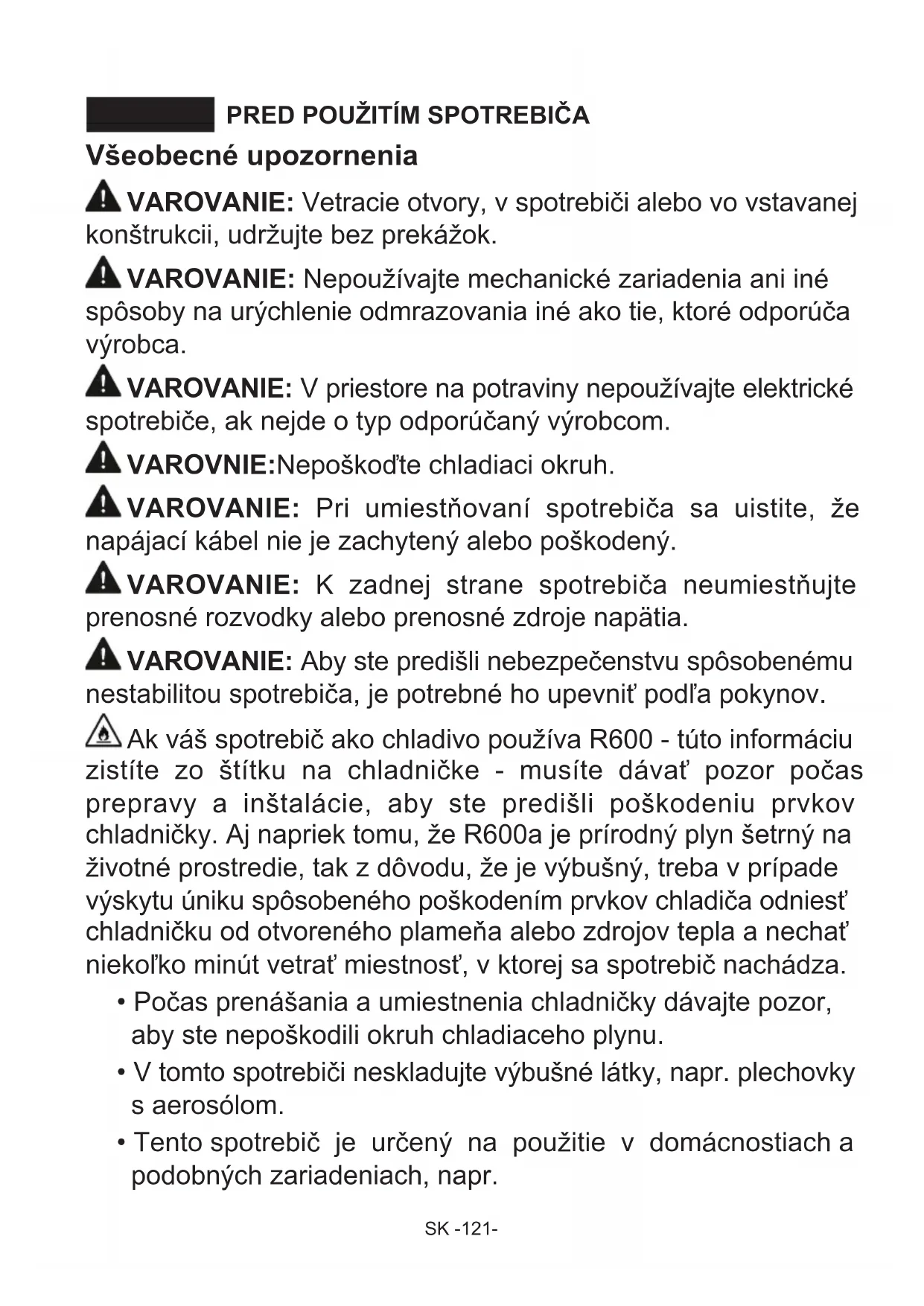 Tipy na šetrenie energie ............................................................................... 141 ČASTI SPOTREBIČE A PRÍSLUŠENSTVO ......................................... 142SK -121- Všeobecné upozornenia VAROVANIE: Vetracie otvory, v spotrebiči alebo vo vstavanej konštrukcii, udržujte bez prekážok. VAROVANIE: Nepoužívajte mechanické zariadenia ani iné spôsoby na urýchlenie odmrazovania iné ako tie, ktoré odporúča výrobca. VAROVANIE: V priestore na potraviny nepoužívajte elektrické spotrebiče, ak nejde o typ odporúčaný výrobcom. VAROVNIE:Nepoškoďte chladiaci okruh. VAROVANIE: Pri umiestňovaní spotrebiča sa uistite, že napájací kábel nie je zachytený alebo poškodený. VAROVANIE: K zadnej strane spotrebiča neumiestňujte prenosné rozvodky alebo prenosné zdroje napätia. VAROVANIE: Aby ste predišli nebezpečenstvu spôsobenému nestabilitou spotrebiča, je potrebné ho upevniť podľa pokynov. Ak váš spotrebič ako chladivo používa R600 - túto informáciu zistíte zo štítku na chladničke - musíte dávať pozor počas prepravy a inštalácie, aby ste predišli poškodeniu prvkov chladničky. Aj napriek tomu, že R600a je prírodný plyn šetrný na životné prostredie, tak z dôvodu, že je výbušný, treba v prípade výskytu úniku spôsobeného poškodením prvkov chladiča odniesť chladničku od otvoreného plameňa alebo zdrojov tepla a nechať niekoľko minút vetrať miestnosť, v ktorej sa spotrebič nachádza.