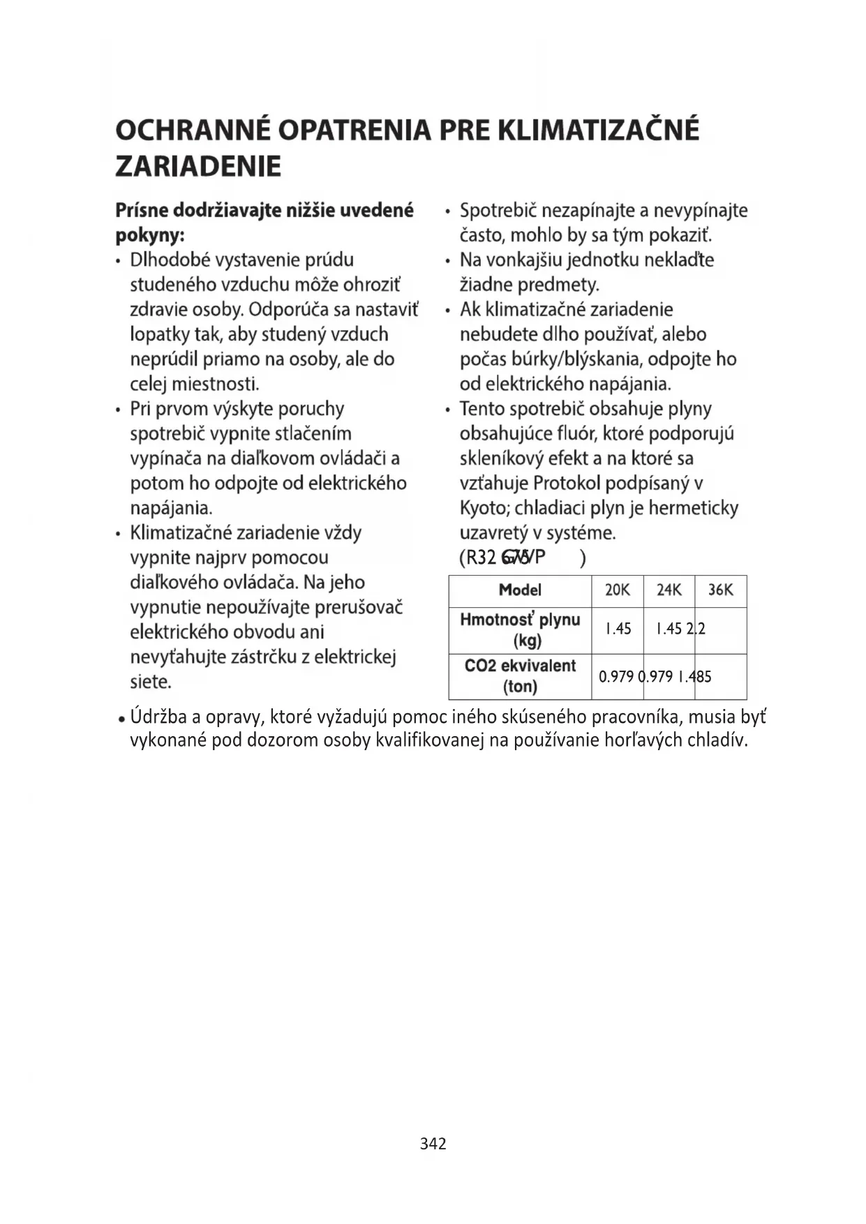 Pri odstraňovaní chladiva zo systému, či už pri servisných prácach alebo vyradení z prevádzky, sa odporúčajú bezpečné postupy pre odstránenie všetkých chladív. Pri prekladaní chladiva do valcov sa uiste, aby boli použité správne valce na regeneráciu chladiva. Dbajte, aby ste mali k dispozícii správny počet valcov, do ktorých sa vmes náplň z celého systému. Všetky valce, ktoré sa použijú, sú určené pre regenerované chladivo a označené pre toto chladivo (t. j. špeciálne valce pre regeneráciu chladiva). Valce musia byť vybavené pretlakovým venlom348 a súvisiacimi uzatváracími venlmi v dobrom prevádzkovom stave. Pred regeneráciou sú prázdne regeneračné valce vákuované a podľa možnos vychladené. Regeneračné zariadenie musí byť v dobrom prevádzkovom stave v súlade s pokynmi k tomuto zariadeniu a vhodné na regeneráciu horľavých chladív. Okrem toho musia byť k dispozícii kalibrované váhy v dobrom prevádzkovom stave. Hadice musia byť vybavené tesniacimi odpájateľnými spojkami a v dobrom stave. Pred použim regeneračného stroja skontrolujte, či je v uspokojivom prevádzkovom stave, bol správne udržiavaný a súvisiace elektrické komponenty sú utesnené, aby sa predišlo vznieteniu v prípade uvoľnenia chladiva. V prípade pochybnos sa poraďte s výrobcom. Regenerované chladivo sa vráť dodávateľovi chladiva v správnom regeneračnom valci a vybavené označením Prevoz odpadu. Nemiešajte chladivá v regeneračných jednotkách, hlavne nie vo valcoch. Ak sa majú odstrániť kompresory alebo kompresorové oleje, dbajte, aby boli odvzdušnené na prijateľnú úroveň, aby v mazive nezostalo horľavé chladivo. Proces odvzdušnenia sa vykoná pred vrátením kompresora dodávateľom. Na zrýchlenie tohto procesu sa použije iba elektrické ohrievanie telesa kompresora. Po vypustení oleja zo systému pracujte bezpečne. Pri sťahovaní alebo premiestňovaní klimazácie sa poraďte so skúsenými servisnými technikmi, ako jednotku odpojiť a znova nainštalovať. Pod internú ani externú jednotku neumiestňujte nijaké iné elektrické zariadenia ani vybavenie domácnos. Kvapkajúci kondenzát by ich mohol zamočiť, a spôsobiť tak škodu na vašom majetku alebo poruchu. Dbajte, aby vetracie otvory neboli zablokované. Spotrebič musí byť skladovaný na dobre vetranom priestranstve, kde veľkosť miestnos zodpovedá ploche miestnos určenej pre prevádzku. Spotrebič musí byť skladovaný v miestnos, kde sa nepretržite nepracuje s otvoreným plameňom (napríklad pustený plynový spotrebič) a zdrojmi vznietenia (napríklad pustený elektrický ohrievač). Opakovane použiteľné mechanické spojky a obrubové spoje nie sú dovolené.349OPIS SPOTREBICA