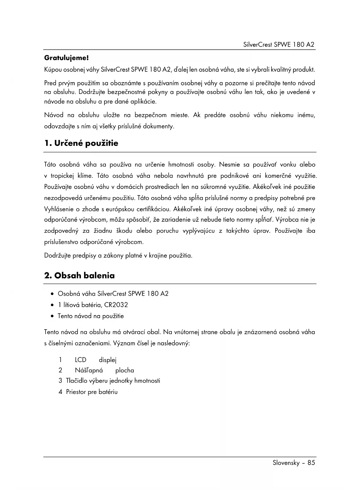 12. Informácie o záruke a servise ..................................................................... 95SilverCrest SPWE 180 A2 Slovensky – 85 Gratulujeme! Kúpou osobnej váhy SilverCrest SPWE 180 A2, ďalej len osobná váha, ste si vybrali kvalitný produkt. Pred prvým použitím sa oboznámte s používaním osobnej váhy a pozorne si prečítajte tento návod na obsluhu. Dodržujte bezpečnostné pokyny a používajte osobnú váhu len tak, ako je uvedené v návode na obsluhu a pre dané aplikácie. Návod na obsluhu uložte na bezpečnom mieste. Ak predáte osobnú váhu niekomu inému, odovzdajte s ním aj všetky príslušné dokumenty.