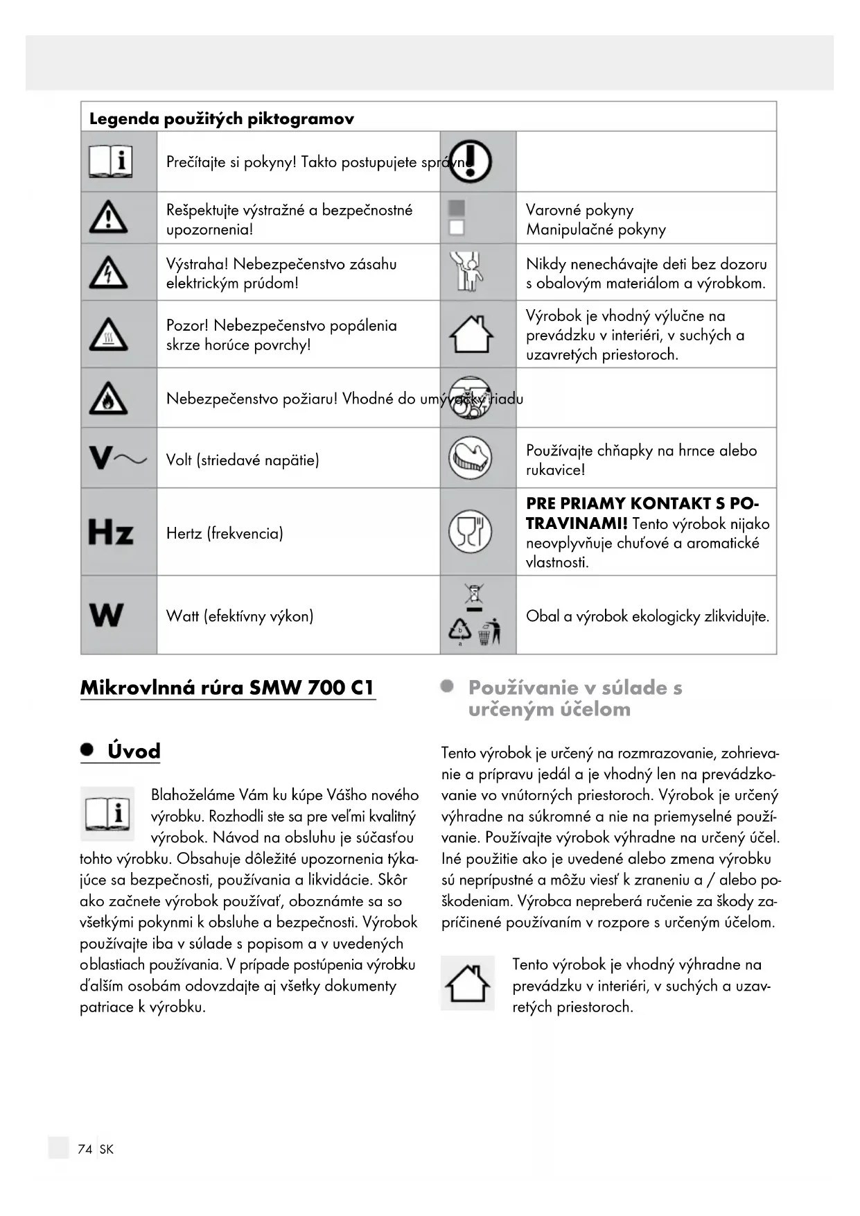 Obal a výrobok ekologicky zlikvidujte. Mikrovlnná rúra SMW 700 C1 Úvod Blahoželáme Vám ku kúpe Vášho nového výrobku. Rozhodli ste sa pre veľmi kvalitný výrobok. Návod na obsluhu je súčasťou tohto výrobku. Obsahuje dôležité upozornenia týka- júce sa bezpečnosti, používania a likvidácie. Skôr ako začnete výrobok používať, oboznámte sa so všetkými pokynmi k obsluhe a bezpečnosti. Výrobok používajte iba v súlade s popisom a v uvedených