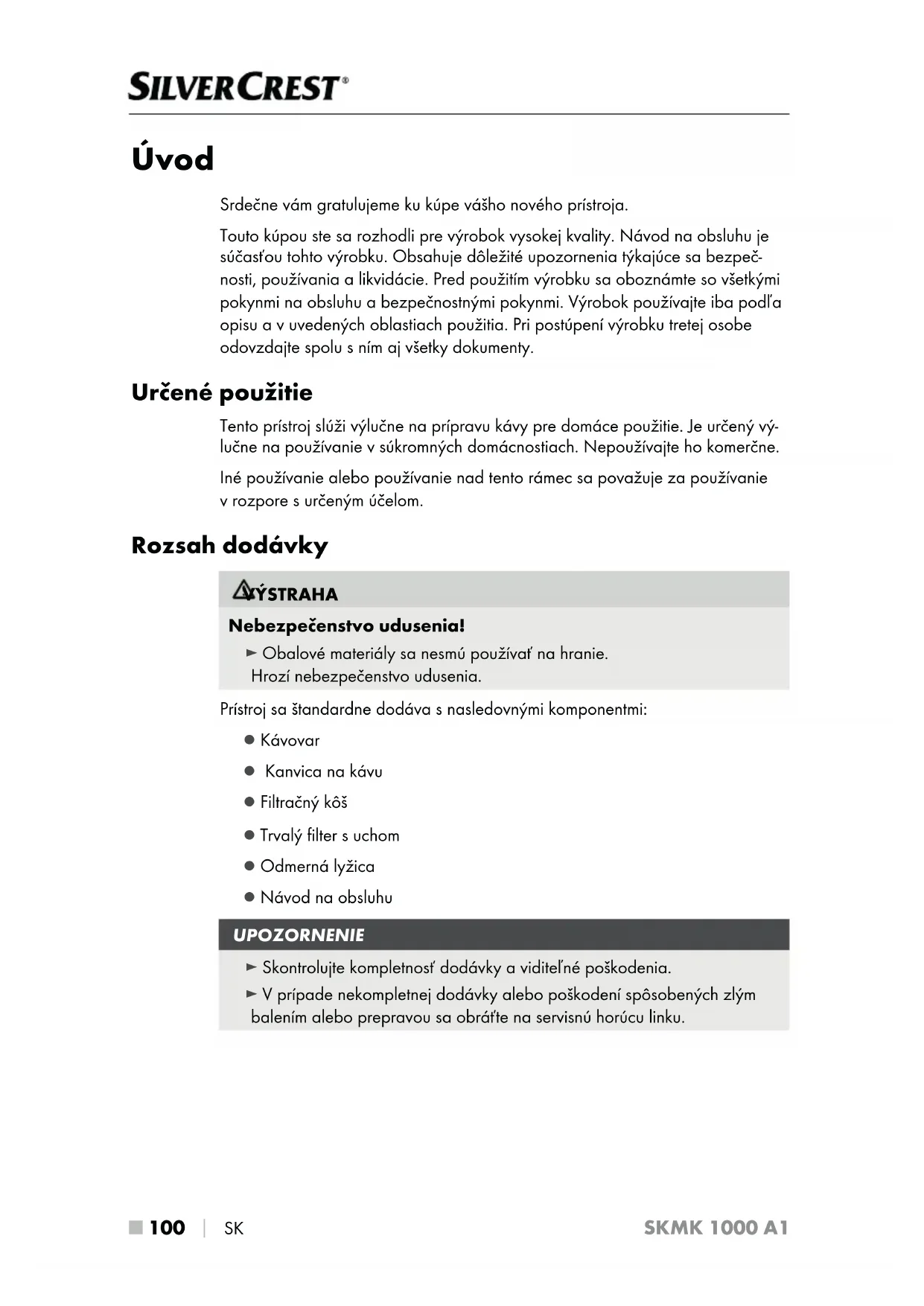 SK SKMK 1000 A1 Úvod Srdečne vám gratulujeme ku kúpe vášho nového prístroja. Touto kúpou ste sa rozhodli pre výrobok vysokej kvality. Návod naobsluhu je súčasťou tohto výrobku. Obsahuje dôležité upozornenia týkajúce sa bezpeč- nosti, používania a likvidácie. Pred použitím výrobku sa oboznámte sovšetkými pokynmi na obsluhu a bezpečnostnými pokynmi. Výrobok používajte iba podľa opisu a vuvedených oblastiach použitia. Pri postúpení výrobku tretej osobe odovzdajte spolu sním aj všetky dokumenty. Určené použitie Tento prístroj slúži výlučne na prípravu kávy pre domáce použitie. Je určený vý- lučne na používanie vsúkromných domácnostiach. Nepoužívajte ho komerčne. Iné používanie alebo používanie nad tento rámec sapovažuje zapoužívanie v rozpore surčeným účelom. Rozsah dodávky VÝSTRAHA Nebezpečenstvo udusenia! ► Obalové materiály sa nesmú používať na hranie. Hrozí nebezpečenstvo udusenia. Prístroj sa štandardne dodáva snasledovnými komponentmi: ▯ Kávovar ▯ Kanvica na kávu ▯ Filtračný kôš ▯ Trvalý filter s uchom ▯ Odmerná lyžica ▯ Návod na obsluhu UPOZORNENIE ► Skontrolujte kompletnosť dodávky a viditeľné poškodenia. ► V prípade nekompletnej dodávky alebo poškodení spôsobených zlým balením alebo prepravou sa obráťte na servisnú horúcu linku.SK