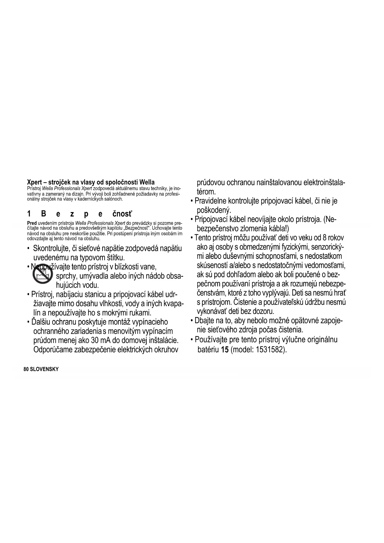 skrutku. 6 Likvidácia V tomto elektrickom zariadení sa nachádza lítium-iónový akumulá- tor. Batériu je pred likvidáciou potrebné vymontovať (pozri „Výmena batérie“ na strane 83). Batériu v žiadnom prípade nevyhadzujte do kontajneru na zmiešaný odpad. V prípade, že sa prístroj viac nebude používať, musí sa odovzdať na mieste kúpy alebo na špeciálnom zbernom mieste príslušného miestneho verejného zberného zariadenia (zberný dvor, zberné su- roviny atď.). 7 Servis Podľa aktuálneho stavu techniky podliehajú časti elektronických prístrojov za urči- tý čas v určitom rozsahu opotrebovaniu. Pre zachovanie bezchybnej funkčnosti a bezpečnosti prístroja sa musí vykonávať jeho pravidelná kontrola podľa zákonných nariadení platných v danej krajine – mi- nimálne však každé 2 roky. 8Dvojročná záruka Ako výrobca Vám na naše produkty poskytujeme od dátumu kúpy dvojročnú záru- ku na všetky nedostatky vyplývajúce z materiálových alebo výrobných chýb. V prí- pade, že sa aj napriek našej snahe v rámci tohto obdobia vyskytnú na prístroji nedostatky, zaručujeme Vám, že vám prístroj podľa nášho uváženia opravíme alebo vymeníme za bezchybný. Tieto služby je možné poskytnúť iba po predlože- ní originálnej faktúry, príp. dokladu o kúpe. Doklad o kúpe si uschovajte za účelom preukázania dátumu kúpy. Záruka sa nevzťahuje na škody spôsobené neodborným použitím a normálnym opotrebovaním. Nárok na záruku zaniká aj v takom prípade, ak na prístroji vykonali zmeny neautorizované servisy alebo ak sa pri montáži použili cudzie produkty. Na nedostatky, ktoré hodnotu a možnosť použitia produktu ovplyvňujú zanedba- teľným spôsobom, sa záruka nevzťahuje. Záruka sa nevzťahuje na spotrebné diely. Typické diely, ktoré pravidelne podlie- hajú opotrebovaniu a preto sa na ne nevzťahuje záruka, sú predovšetkým batéria a nožová hlava. Vaše zmluvné a zákonné nároky voči predajcovi zostávajú touto zárukou výrobcu nedotknuté. V prípade nároku na záruku, prosím, kontaktujte autorizovaný zákaz- nícky servis Wella vo vašom okolí. Adresu a telefónne číslo najbližšieho zákazníckeho servisu Wella nájdete na inter- netovej stránke www.wella.com. Li-ion U24_Wella_Xpert.book Seite 84 Mittwoch, 29. Oktober 2014 4:07 0485SLOVENSKY U24_Wella_Xpert.book Seite 85 Mittwoch, 29. Oktober 2014 4:07 0486 MAGYAR Xpert – hajvágógép a Wellától A Wella Professionals Xpert megfelel a korszerű technológiáknak, innovatív és designközpontú. A fejlesztése során a fodrászatokban használt professzionális hajvágógépekkel szembeni követelményeket vettük figyelembe. 1 Biztonság Kérjük, gondosan olvassa el a használati útmutatót, különös tekintettel a „Bizton- ság” című fejezetre, mielőtt a Wella Professionals Xpert készüléket üzembe he- lyezi. Őrizze meg a használati útmutatót későbbi használatra. Ha a készüléket másnak adja tovább, akkor ezt az útmutatót is adja át.