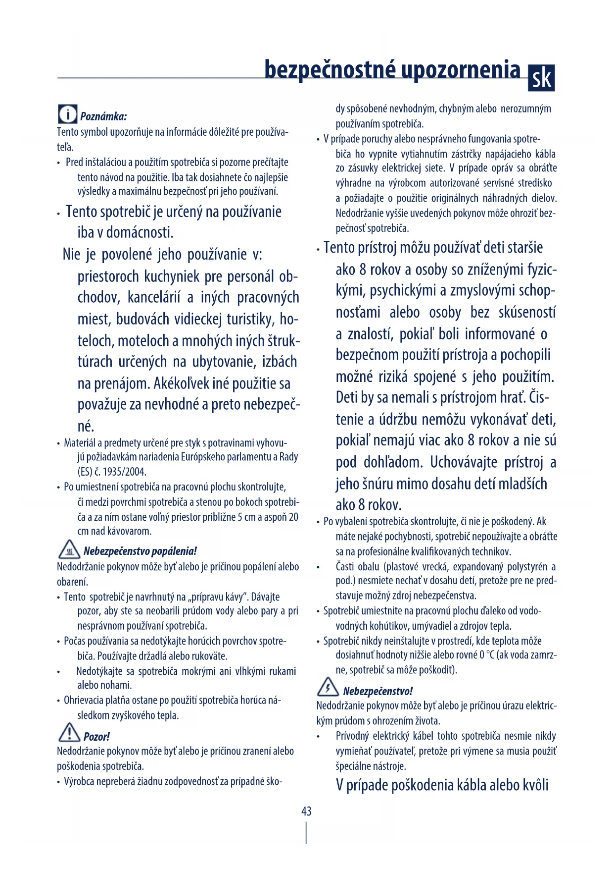 - Tento spotrebič je navrhnutý na „prípravu kávy”. Dávajte pozor, aby ste sa neobarili prúdom vody alebo pary a pri nesprávnom používaní spotrebiča.