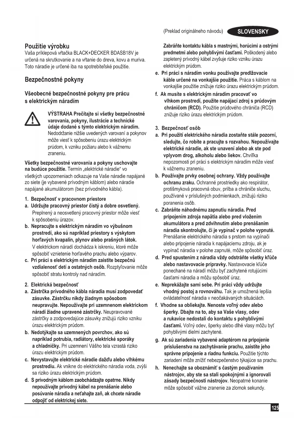 Vŕtanie do muriva Pri vŕtaní do muriva nastavte objímku (3) do polohy na príklepové vŕtanie zarovnaním symbolu s príslušnou značkou. Posuňte volič prevodových stupňov (5) smerom k prednej časti náradia (2. prevodový stupeň). Skrutkovanie u Vždy používajte správny typ a veľkosť skrutkovacieho násadca. (Preklad originálneho návodu) SLOVENSKY131 u Ak sa nedajú skrutky správne pritiahnuť, použite ako mazivo malé množstvo saponátu alebo mydlového roztoku. u Vždy držte náradie so skrutkovacím násadcom v jednej osi so skrutkou. Odstraňovanie porúch Problém Možná príčina Možné riešenie Náradie nie je možné spustiť. Akumulátor nie je nabitý. Skontrolujte, či nie je nutné nabitie akumulátora. Akumulátor sa nenabíja. Prívodný kábel nabí- jačky nie je pripojený k sieťovej zásuvke. Príliš vysoká alebo príliš nízka teplota okolitého prostredia. Pripojte prívodný kábel nabíjačky k sieťovej zásuvke. Premiestnite nabíjačku a prívodný do prostredia, v ktorom je teplota vyššia než 4,5 °C alebo nižšia než 40,5 °C. Náradie sa náhle vypne. Akumulátor dosiahol svoj maximálny teplotný limit. Akumulátor je vybitý. Tento akumulátor je vyrobený tak, aby došlo k jeho okamžitému vypnutiu, ak dôjde k jeho vybitiu, aby bola maximalizovaná jeho prevádzková životnosť. Nechajte akumulátor vychladnúť. Vložte ho do nabíjačky a nechajte ho úplne nabiť. Údržba Vaše náradie BLACK+DECKER bolo skonštruované tak, aby pracovalo dlhý čas s minimálnymi nárokmi na údržbu. Dôkladná starostlivosť o náradie a jeho pravidelné čistenie Vám zaistia jeho bezproblémový chod. Vaša nabíjačka nevyžaduje žiadnu údržbu okrem pravidelného čistenia. Varovanie! Pred akoukoľvek údržbou vyberte z náradia akumulátor. Pred čistením odpojte nabíjačku od siete. u Vetracie otvory náradia a nabíjačky pravidelne čistite mäkkou kefou alebo suchou handričkou. u Pomocou vlhkej handričky pravidelne čistite kryt motora. Nepoužívajte žiadne abrazívne čistiace prostriedky alebo rozpúšťadlá. u Pravidelne otvárajte skľučovadlo a poklepom odstráňte prach z jeho vnútornej časti. Ochrana životného prostredia Trieďte odpad. Výrobky a akumulátory označené týmto symbolom sa nesmú vyhodiť do bežného domového odpadu. Tieto výrobky a akumulátory obsahujú materiály, ktoré je možné obnoviť alebo recyklovať, čo znižuje dopyt po surovinách. Recyklujte, prosím, elektrické výrobky a akumulátory podľa miestnych predpisov. Ďalšie informácie nájdete na internetovej adrese www.2helpU.com Technické údaje BDASB18 Napájacie napätie V 18 Otáčky naprázdno min