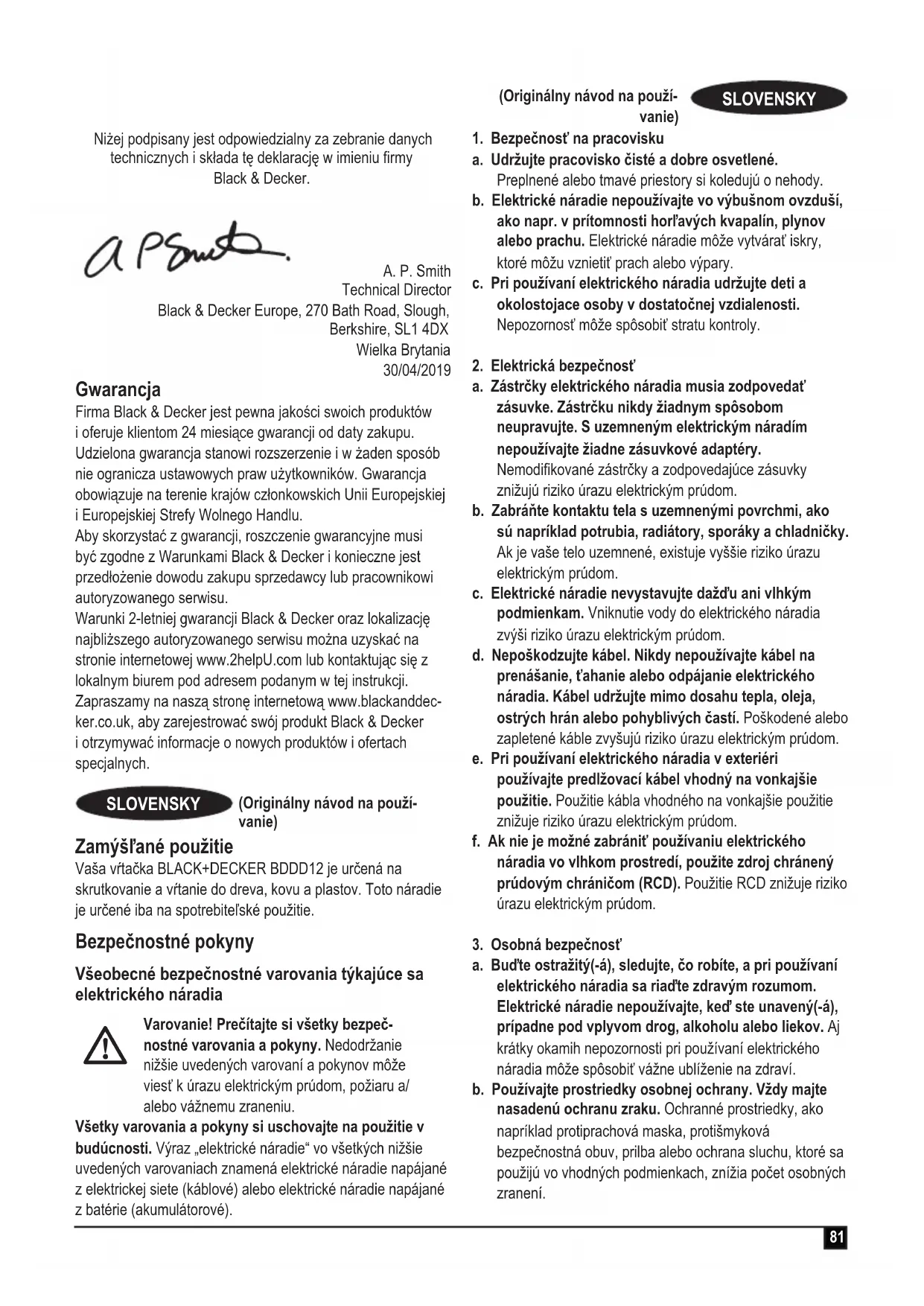 Vŕtačka BDDD12 Spoločnosť Black & Decker vyhlasuje, že tieto produkty, opísané v časti „Technické údaje“ vyhovujú nasledujúcim normám: 2006/42/ES, EN60745-1: 2009+A11: 2010, EN60745-2-1: 2010 a EN60745-2-2: 2010. Tieto produkty sú tiež v súlade so smernicou 2014/30/EÚ a 2011/65/EÚ. Ďalšie informácie vám poskytne spoločnosť Black & Decker na nasledujúcej adrese (prípadne si pozrite zadnú stranu návodu). Nižšie podpísaná osoba zodpovedá za zostavenie technickej dokumentácie a uskutočňuje toto vyhlásenie v mene spoloč- nosti Black & Decker. A. P. Smith Technický riaditeľ Black & Decker Europe, 270 Bath Road, Slough, Berkshire, SL1 4DX Veľká Británia
