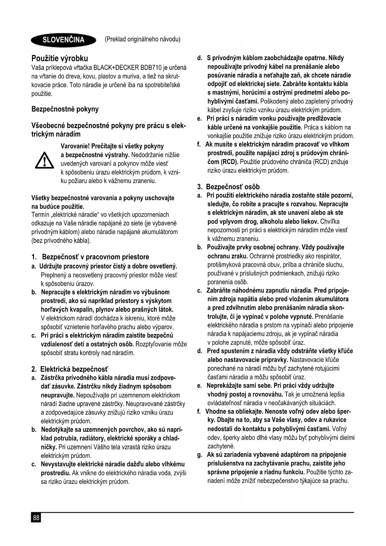 Nastavenie hĺbky vŕtania (obr. G) uPovoľte bočnú rukoväť (7) otáčaním proti smeru pohybu hodinových ručičiek. uNastavte hĺbkový doraz (6) do požadovanej polohy. Maximálna hĺbka vŕtania zodpovedá vzdialenosti medzi špičkou vrtáka a prednej koncovej časti hĺbkového dorazu. uUtiahnite bočnú rukoväť otáčaním v smere pohybu hodi- nových ručičiek. Zapnutie a vypnutie uAk chcete náradie zapnúť, stlačte spínač s plynulou reguláciou otáčok (1). Otáčky náradia závisia od intenzity stlačenia tohto vypínača. Dodržiavajte základné pravidlo, ak budete používať vrtáky s veľkým priemerom, používajte nízke otáčky, a ak budete používať vrtáky s menším priemerom, používajte vysoké otáčky. uAk chcete náradie používať v režime nepretržitej pre- vádzky, stlačte zaisťovacie tlačidlo (2) a uvoľnite spínač s plynulou reguláciou otáčok. Táto možnosť je k dispozícii iba pri prevádzke v maximálnych otáčkach, a to pre pravý/ ľavý chod. uAk chcete náradie vypnúť, uvoľnite spínač s plynulou re- guláciou otáčok. Ak chcete vypnúť náradie, ktoré pracuje v režime nepretržitého chodu, znovu stlačte a uvoľnite spínač s plynulou reguláciou otáčok. Príslušenstvo Výkon Vášho náradia závisí od používaného príslušenstva. Príslušenstvo BLACK+DECKER je navrhnuté a vyrobené podľa noriem pre vysokú kvalitu a je určené na zvýšenie vý- konu vášho zariadenia. Použitím tohto príslušenstva docielite najlepší výsledok, aký Vám Vaše náradie môže poskytnúť. Údržba Vaše náradie BLACK+DECKER bolo skonštruované tak, aby pracovalo dlhý čas s minimálnymi nárokmi na údržbu. Dôkladná starostlivosť o náradie a jeho pravidelné čistenie Vám zaistia jeho bezproblémový chod. Varovanie! Pred vykonávaním akejkoľvek údržby náradia napájaného káblom alebo akumulátorom: uVypnite zariadenie/náradie a odpojte ho od siete. uAlebo zariadenie/náradie vypnite a vyberte z neho akumu- látor, ak je toto zariadenie/náradie napájané odoberateľ- ným akumulátorom. uAlebo ak nie je možné akumulátor vybrať, nechajte nára- die v chode, kým nedôjde k úplnému vybitiu akumulátora. uPred čistením odpojte nabíjačku od siete. Vaša nabíjačka nevyžaduje žiadnu údržbu okrem pravidelného čistenia. uVetracie otvory zariadenia/náradia/nabíjačky pravidelne čistite mäkkou kefou alebo suchou handričkou. uPomocou vlhkej handričky pravidelne čistite kryt motora. Nepoužívajte žiadne abrazívne čistiace prostriedky alebo rozpúšťadlá. uPravidelne otvárajte skľučovadlo a poklepaním odstráňte prach z vnútornej časti náradia (ak je náradie opatrené skľučovadlom). Výmena sieťovej zástrčky (iba pre Veľkú Britániu a Írsko) Ak budete inštalovať novú zástrčku prívodného kábla: uBezpečne zlikvidujte starú zástrčku. uPripojte hnedý vodič k svorke pod napätím na novej zástrčke. uModrý vodič pripojte k nulovej svorke. Varovanie! Na uzemňovaciu svorku nebude pripojený žiadny vodič. Dodržujte montážne pokyny dodávané s kvalitnými zástrčkami. Odporúčaná poistka: 5 A. Ochrana životného prostredia Trieďte odpad. Výrobky a akumulátory označené týmto symbolom sa nesmú vyhadzovať do bežného domáceho odpadu. Výrobky a akumulátory obsahujú materiály, ktoré je možné obnoviť alebo recyklovať, čo znižuje dopyt po surovinách. Recyklujte, prosím, elektrické výrobky a akumulátory podľa miestnych predpisov. Ďalšie informácie nájdete na internetovej adrese www.2helpU.com92 (Preklad originálneho návodu) SLOVENČINA Technické údaje BDB710 Vstupné napätie V 230 Príkon W 710 Otáčky naprázdno min