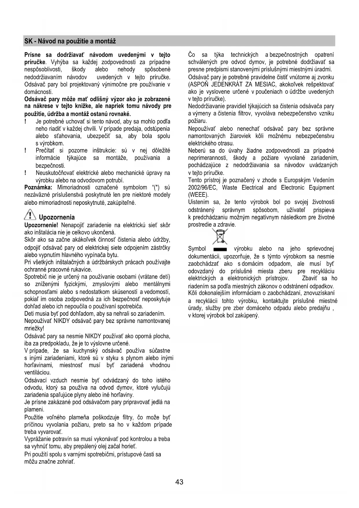 Jestliže osvětlení nefunguje, dříve než zavoláte servis si ověřte, zda jste správně nasadili žárovky do uložení.43 SK - Návod na použitie a montáž Prísne sa dodržiavať návodom uvedenými v tejto príručke. Vyhýba sa každej zodpovednosti za prípadne nespôsoblivosti, škody alebo nehody spôsobenè nedodržiavaním návodov uvedených v tejto príručke. Odsávač pary bol projektovaný výnimočne pre používanie v domácnosti. Odsávač pary môže mať odlišný výzor ako je zobrazené na nákrese v tejto knižke, ale napriek tomu návody pre použitie, údržba a montáž ostanú rovnaké. ! Je potrebné uchovať si tento návod, aby sa mohlo podľa neho riadiť v každej chvíli. V prípade predaja, odstúpenia alebo sťahovania, ubezpečiť sa, aby bola spolu s výrobkom. ! Prečítať si pozorne inštrukcie: sú v nej dôležité informácie týkajúce sa montáže, používania a bezpečnosti. ! Neuskutočňovať elektrické alebo mechanické úpravy na výrobku alebo na odvodovom potrubí. Poznámka: Mimoriadnosti označené symbolom “(*) sú nezáväzné príslušenstvá poskytnuté len pre niektoré modely alebo mimoriadnosti neposkytnuté, zakúpiteľné. Upozornenia Upozornenie! Nenapojiť zariadenie na elektrickú sieť skôr ako inštalácia nie je celkovo ukončená. Skôr ako sa začne akákoľvek činnosť čistenia alebo údržby, odpojiť odsávač pary od elektrickej siete odpojením zástrčky alebo vypnutím hlavného vypínača bytu. Pri všetkých inštalačných a údržbárskych prácach používajte ochranné pracovné rukavice. Spotrebič nie je určený na používanie osobami (vrátane detí) so zníženými fyzickými, zmyslovými alebo mentálnymi schopnosťami alebo s nedostatkom skúseností a vedomostí, pokiaľ im osoba zodpovedná za ich bezpečnosť neposkytuje dohľad alebo ich nepoučila o používaní spotrebiča. Deti musia byť pod dohľadom, aby sa nehrali so zariadením. Nepoužívať NIKDY odsávač pary bez správne namontovanej mriežky! Odsávač pary sa nesmie NIKDY používať ako oporná plocha, iba za predpokladu, že je to výslovne určené. V prípade, že sa kuchynský odsávač používa súčastne s inými zariadeniami, ktoré sú v styku s plynom alebo inými horľavinami, miestnosť musí byť zariadená vhodnou ventiláciou. Odsávací vzduch nesmie byť odvádzaný do toho istého odvodu, ktorý sa používa na odvod dymov, ktoré vylučujú zariadenia spaľujúce plyny alebo iné horľaviny. Je prísne zakázané pod odsávačom pary pripravovať jedlá na plameni. Použitie voľného plameňa poškodzuje filtry, čo može byť príčinou vyvolania požiaru, preto sa ho v každom prípade treba vyvarovať. Vyprážanie potravín sa musí vykonávať pod kontrolou a treba sa vyhnúť tomu, aby prepálený olej začal horieť. Pri použití spolu s varnými spotrebičmi, prístupové časti sa môžu značne zohriať. Čo sa týka technických a bezpečnostných opatrení schválených pre odvod dymov, je potrebné dodržiavať sa presne predpismi stanovenými príslušnými miestnými úradmi. Odsávač pary je potrebné pravidelne čistiť vnútorne aj zvonku (ASPOŇ JEDENKRÁT ZA MESIAC, akokoľvek rešpektovať ako je vyslovene určené v poučeniach o údržbe uvedených v tejto príručke). Nedodržiavanie pravidiel týkajúcich sa čistenia odsávača pary a výmeny a čistenia filtrov, vyvoláva nebezpečenstvo vzniku požiaru. Nepoužívať alebo nenechať odsávač pary bez správne namontovaných žiaroviek kôli možnému nebezpečenstvu elektrického otrasu. Neberú sa do úvahy žiadne zodpovednosti za prípadné neprimerannosti, škody a požiare vyvolané zariadením, pochádzajúce z nedodržiavania sa návodov uvádzaných v tejto príručke. Tento prístroj je poznačený v zhode s Europským Vedením 2002/96/EC, Waste Electrical and Electronic Equipment (WEEE). Uistením sa, že tento výrobok bol po svojej životnosti odstránený správnym spôsobom, užívateľ prispieva k predchádzaniu možným negatívnym následkom pre životné prostredie a zdravie. Symbol výrobku alebo na jeho sprievodnej dokumentácii, upozorňuje, že s týmto výrobkom sa nesmie zaobchádzať ako s domácim odpadom, ale musí byť odovzdaný do príslušné miesta zberu pre recykláciu elektrických a elektronických prístrojov. Zbaviť sa ho riadením sa podľa miestných zákonov o odstránení odpadkov. Kôli dokonalejším informáciam o zaobchádzaní, znovuzískaní a recyklácii tohto výrobku, kontaktujte príslušné miestné úrady, služby pre zber domáceho odpadu alebo predajňu , v ktorej výrobok bol zakúpený.44 Používanie Odsávač pary je realizovaný na požitie vo verzii odsávania a vonkajšej evakulácie alebo filtrácie s vnútornou recykláciou. Odsávacia verzia Výpary sú vypúšťané von prostredníctvom výfukového potrubia upevneného na spojovacej prírube. Priemer výfukového potrubia sa musí zhodovaž s priemerom spojovacieho prstenca. Upozornenie! Evakuačné potrubie nie je dodané, musí byť zakúpené. Na vodorovnej (horizontálnej) časti, potrubie musí mať mierny náklon smerom nahor (približne 10°), aby sa vzduch mohol ľahšie odvádzal smerom von. Ak odsávač pary je vybavený uhlíkovými filtrami, tak tie musia byť odstránené. Napojiť odsávač pary o odvodové trubice a otvory pre múry s rovnakým priemerom ako vývod vzduchu (spojovacia príruba). Použitie odvodových trubíc a otvorov do steny s menším priemerom má za následok zníženie odsávadsej výkonnosti e drastické zvýšenie hlučnosti. V tejto zásluhe sa vyhýba každej zodpovednosti. ! Použiť potrubie dlhé, ktoré je minimálne nevyhnutné. ! Používať potrubie s najmenším možným počtom ohnutím (maximálny uhol ohnutia: 90°). ! Vyhnúť sa drastickým zmenám sekcií potrubia. ! Používať potrubie s čím viac hladkou vnútornou stranou. ! Materiál p