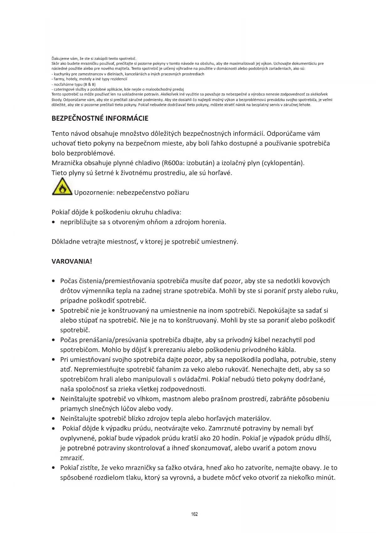Tento návod obsahuje množstvo dôležitých bezpečnostných informácií. Odporúčame vám uchovať eto pokyny na bezpečnom mieste, aby boli ľahko dostupné a používanie spotrebiča bolo bezproblémové. Mraznička obsahuje plynné chladivo (R600a: izobután) a izolačný plyn (cyklopentán). Tieto plyny sú šetrné k životnému prostrediu, ale sú horľavé. Upozornenie: nebezpečenstvo požiaru Pokiaľ dôjde k poškodeniu okruhu chladiva: