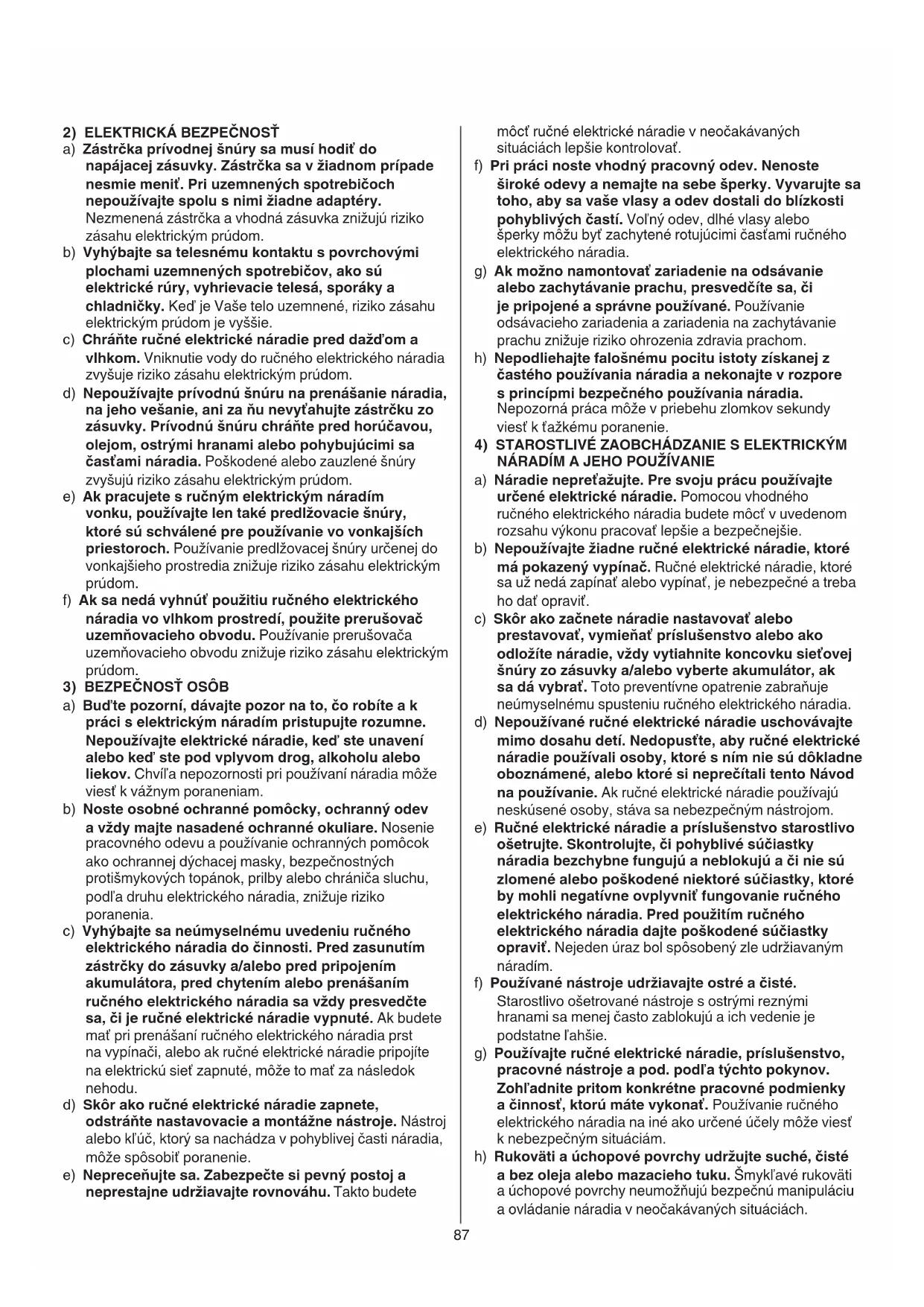 NÁRADÍM A JEHO POUŽÍVANIE a) Náradie nepreťažujte. Pre svoju prácu používajte určené elektrické náradie. Pomocou vhodného ručného elektrického náradia budete môcť v uvedenom rozsahu výkonu pracovať lepšie a bezpečnejšie. b) Nepoužívajte žiadne ručné elektrické náradie, ktoré má pokazený vypínač. Ručné elektrické náradie, ktoré sa už nedá zapínať alebo vypínať, je nebezpečné a treba ho dať opraviť. c) Skôr ako začnete náradie nastavovať alebo prestavovať, vymieňať príslušenstvo alebo ako odložíte náradie, vždy vytiahnite koncovku sieťovej šnúry zo zásuvky a/alebo vyberte akumulátor, ak sa dá vybrať. Toto preventívne opatrenie zabraňuje neúmyselnému spusteniu ručného elektrického náradia. d) Nepoužívané ručné elektrické náradie uschovávajte mimo dosahu detí. Nedopusťte, aby ručné elektrické náradie používali osoby, ktoré s ním nie sú dôkladne oboznámené, alebo ktoré si neprečítali tento Návod na používanie. Ak ručné elektrické náradie používajú neskúsené osoby, stáva sa nebezpečným nástrojom. e) Ručné elektrické náradie a príslušenstvo starostlivo ošetrujte. Skontrolujte, či pohyblivé súčiastky náradia bezchybne fungujú a neblokujú a či nie sú zlomené alebo poškodené niektoré súčiastky, ktoré by mohli negatívne ovplyvniť fungovanie ručného elektrického náradia. Pred použitím ručného elektrického náradia dajte poškodené súčiastky opraviť. Nejeden úraz bol spôsobený zle udržiavaným náradím. f) Používané nástroje udržiavajte ostré a čisté. Starostlivo ošetrované nástroje s ostrými reznými hranami sa menej často zablokujú a ich vedenie je podstatne ľahšie. g) Používajte ručné elektrické náradie, príslušenstvo, pracovné nástroje a pod. podľa týchto pokynov. Zohľadnite pritom konkrétne pracovné podmienky a činnosť, ktorú máte vykonať. Používanie ručného elektrického náradia na iné ako určené účely môže viesť k nebezpečným situáciám. h) Rukoväti a úchopové povrchy udržujte suché, čisté a bez oleja alebo mazacieho tuku. Šmykľavé rukoväti a úchopové povrchy neumožňujú bezpečnú manipuláciu a ovládanie náradia v neočakávaných situáciách.