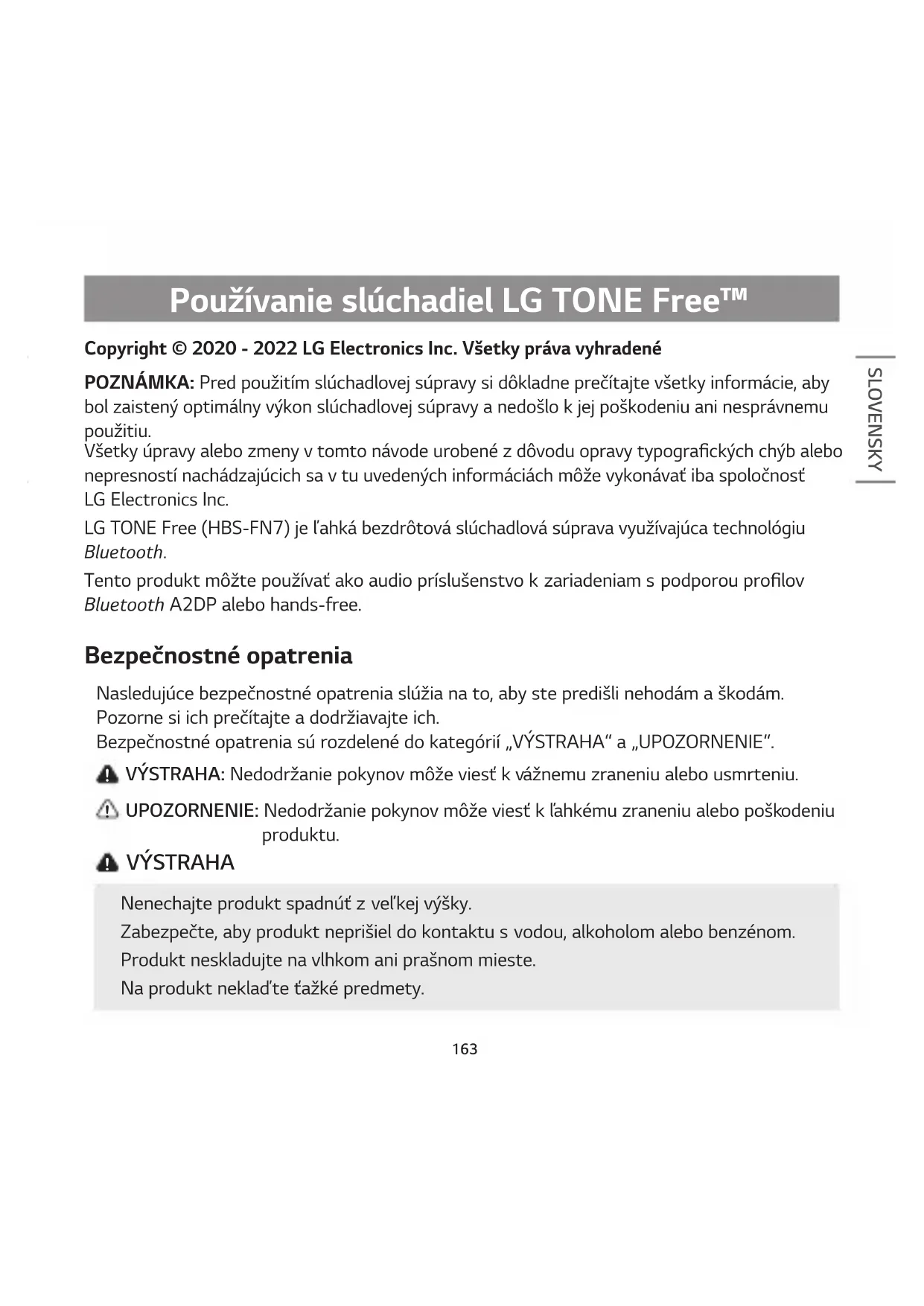 Copyright © 2020 - 2022 LG Electronics Inc. Všetky práva vyhradené POZNÁMKA: Pred použitím slúchadlovej súpravy si dôkladne prečítajte všetky informácie, aby bol zaistený optimálny výkon slúchadlovej súpravy a nedošlo k jej poškodeniu ani nesprávnemu použitiu. Všetky úpravy alebo zmeny v tomto návode urobené z dôvodu opravy typograckých chýb alebo nepresností nachádzajúcich sa v tu uvedených informáciách môže vykonávať iba spoločnosť LG Electronics Inc. LG TONE Free (HBS-FN7) je ľahká bezdrôtová slúchadlová súprava využívajúca technológiu Bluetooth. Tento produkt môžte používať ako audio príslušenstvo kzariadeniam spodporou prolov Bluetooth A2DP alebo hands-free. Bezpečnostné opatrenia Nasledujúce bezpečnostné opatrenia slúžia na to, aby ste predišli nehodám a škodám. Pozorne si ich prečítajte a dodržiavajte ich. Bezpečnostné opatrenia sú rozdelené do kategórií „VÝSTRAHA“ a „UPOZORNENIE“.