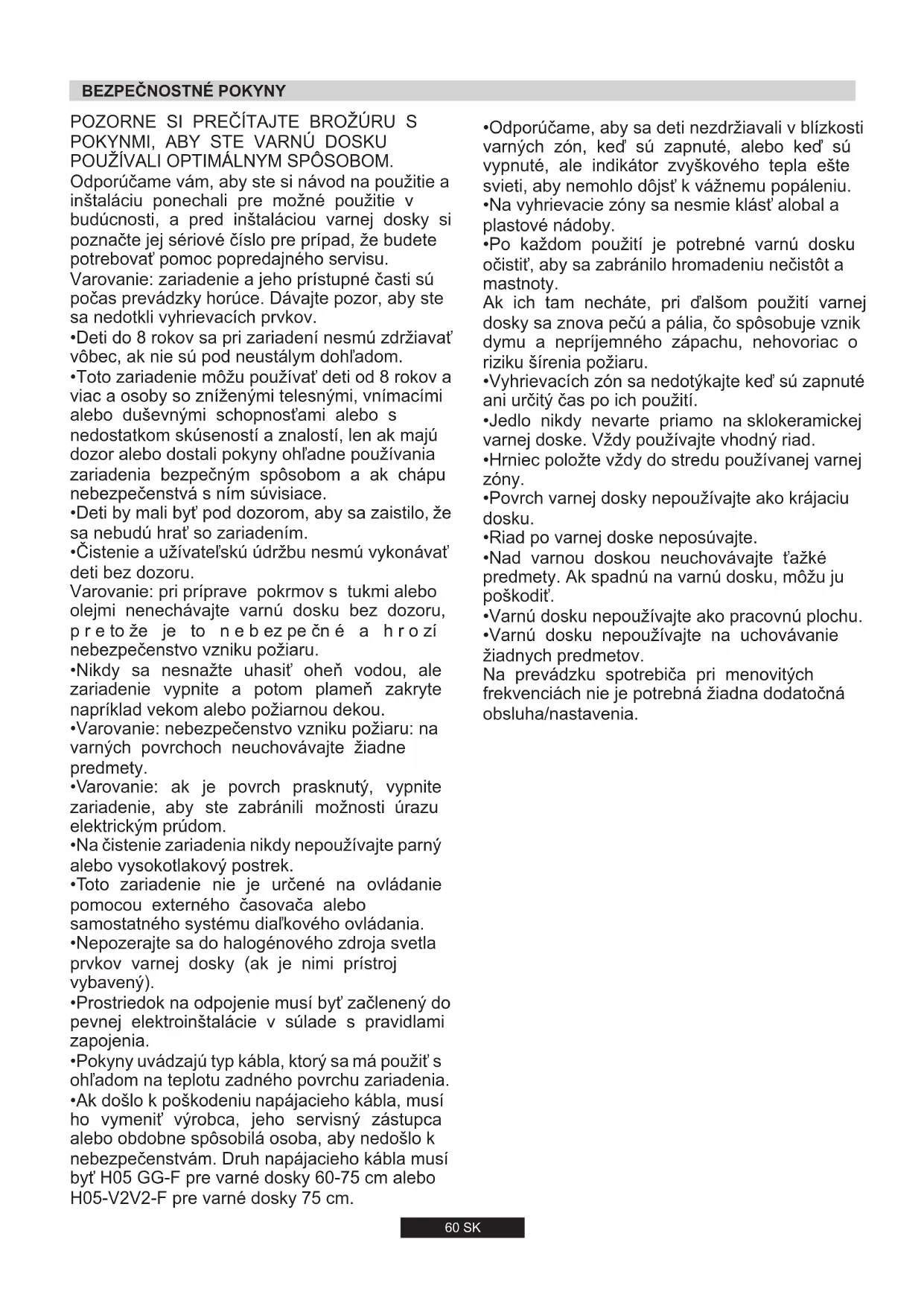 - Ak došlo k poškodeniu napájacieho kábla, musí ho vymeniť výrobca, jeho servisný zástupca alebo obdobne spôsobilá osoba, aby nedošlo k nebezpečenstvám. Druh napájacieho kábla musí byť H05 GG-F pre varné dosky 60-75 cm alebo H05-V2V2-F pre varné dosky 75 cm.Ak spotrebič nie je vybavený elektrickým napájacím káblom a zástrčkou alebo iným zariadením na odpojenie od elektrickej napájacej siete s oddeľovacím kontaktom všetkých pólov, ktoré poskytujú úplné odpojenie v podmienkach prepätia kategórie III, pokyny musia uvádzať, v elektrickom okruhu musia byť nainštalované zariadenia na odpojenie v súlade s elektrickými normami o zapájaní spotrebičov.