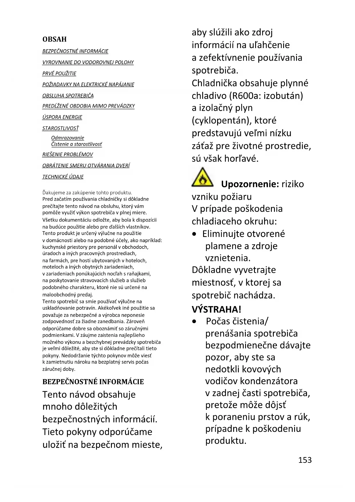 Tento návod obsahuje mnoho dôležitých bezpečnostných informácií. Tieto pokyny odporúčame uložiť na bezpečnom mieste, aby slúžili ako zdroj informácií na uľahčenie a zefektívnenie používania spotrebiča. Chladnička obsahuje plynné chladivo (R600a: izobután) a izolačný plyn (cyklopentán), ktoré predstavujú veľmi nízku záťaž pre životné prostredie, sú však horľavé. Upozornenie: riziko vzniku požiaru V prípade poškodenia chladiaceho okruhu: