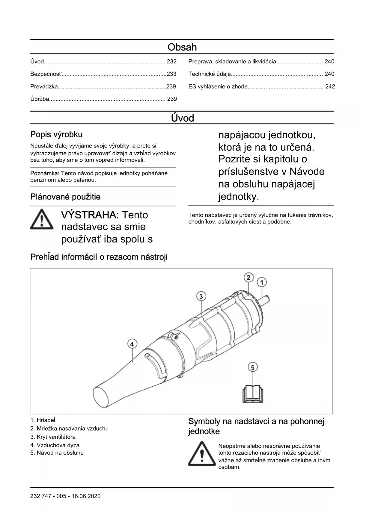 - ES vyhlásenie o zhode Úvod Popis výrobku Neustále ďalej vyvíjame svoje výrobky, a preto si vyhradzujeme právo upravovať dizajn a vzhľad výrobkov bez toho, aby sme o tom vopred informovali. Poznámka: Tento návod popisuje jednotky poháňané benzínom alebo batériou. Plánované použitie VÝSTRAHA: Tento nadstavec sa smie používať iba spolu s napájacou jednotkou, ktorá je na to určená. Pozrite si kapitolu o príslušenstve v Návode na obsluhu napájacej jednotky. Tento nadstavec je určený výlučne na fúkanie trávnikov, chodníkov, asfaltových ciest a podobne. Prehľad informácií o rezacom nástroji p. 242