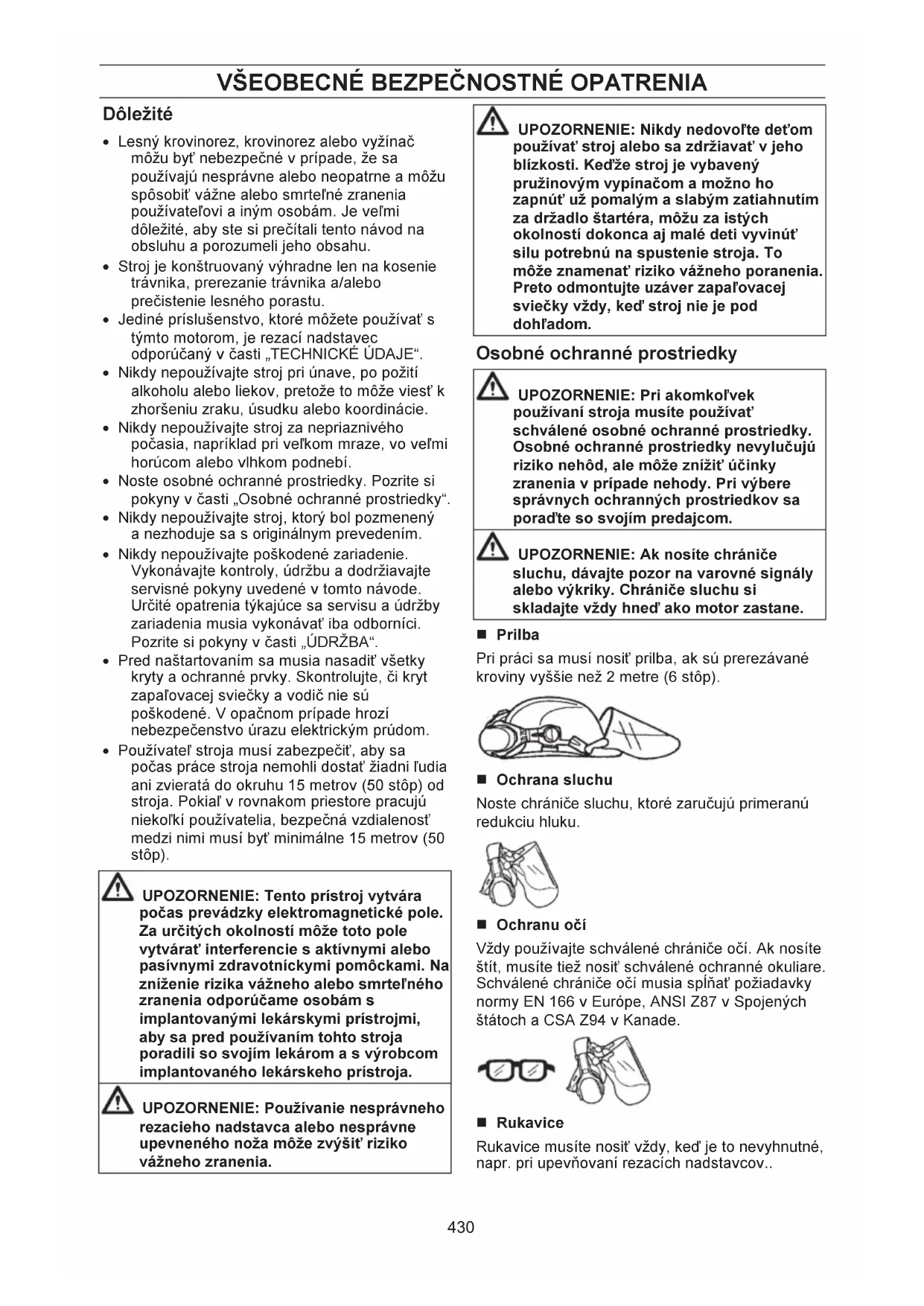 UPOZORNENIE: Lesné krovinorezy, kKrovinorezy a vyžínače môžu byť nebezpečné. Neopatrné alebo nesprávne používanie môže spôsobiť vážne až smrteľné zranenie obsluhe a iným osobám. Skôr, ako začnete stroj používať, si pozorne prečítajte Návod na obsluhu a presvečtepresvedčte sa, že ste porozumeli jeho obsahu. Vždy noste ochrannéú obuv topánky s oceľovou špičkou a protišmykovou podrážkou; hrubé, dlhé nohavice odev s a dlhýmié rukávmiy; odolné protišmykové rukavice; chrániče očí, napríklad priedušné okuliare, ktoré sa nezahmlievajú, alebo chrániče tváre; schvál enú ochrannú prilbu a zvukové tlmičebariéry (zátkové chrániče sluchu alebo tlmiče) na ochranu sluchu. Osoby, ktoré majú dlhé vlasy, by si ich mali (kvôli osobnej bezpečnosti) vypnúťzopnúť. Používateľ stroja musí počas jeho používania zaistiť, aby sa k stroju do vzdialenosti menšej ako 15 metrov (50 stôp) nepriblížili žiadne osoby ani zvieratá.