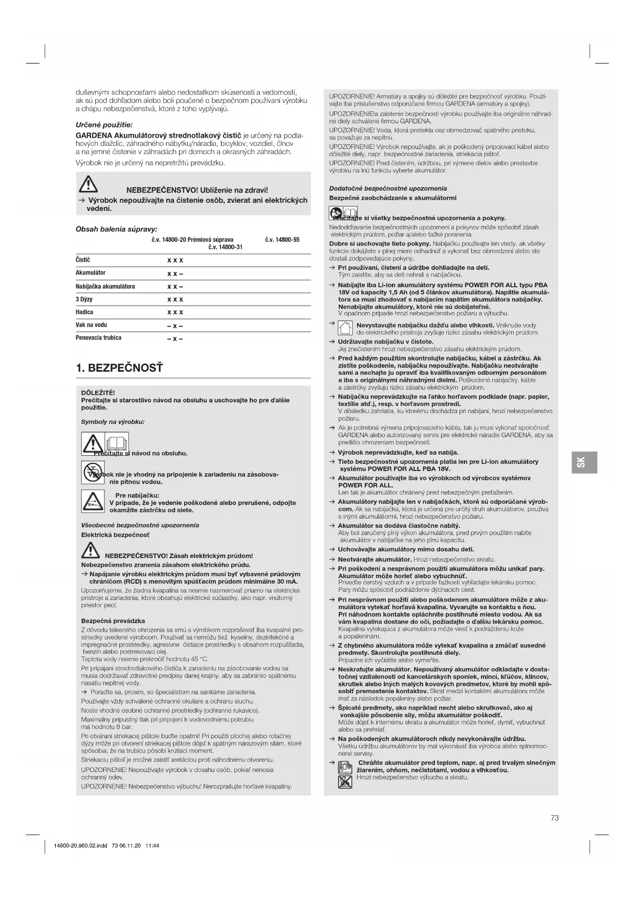duševnými schopnosťami alebo nedostatkom skúseností a vedomostí, ak sú pod dohľadom alebo boli poučené o bezpečnom používaní výrobku a chápu nebezpečenstvá, ktoré z toho vyplývajú. Určené použitie: GARDENA Akumulátorový strednotlakový čistič je určený na podla- hových dlaždíc, záhradného nábytku/náradia, bicyklov, vozidiel, člnov a na jemné čistenie v záhradách pri domoch a okrasných záhradách. Výrobok nie je určený na nepretržitú prevádzku. NEBEZPEČENSTVO! Ublíženie na zdraví! v Výrobok nepoužívajte na čistenie osôb, zvierat ani elektrických vedení. Obsah balenia súpravy: č.v. 14800-20 Prémiová súprava č.v. 14800-31 č.v. 14800-55 Čistič x x x Akumulátor x x – Nabíjačka akumulátora x x – 3 Dýzy x x x Hadica x x x Vak na vodu – x – Penovacia trubica – x – 14800-20.960.02.indd 73 06.11.20 11:44SK