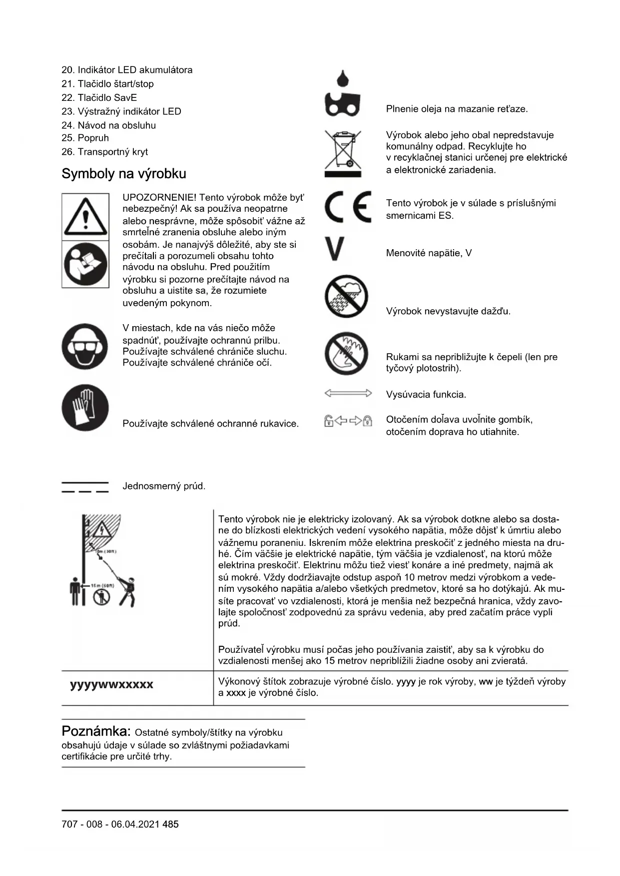 Symboly na výrobku UPOZORNENIE! Tento výrobok môže byť nebezpečný! Ak sa používa neopatrne alebo nesprávne, môže spôsobiť vážne až smrteľné zranenia obsluhe alebo iným osobám. Je nanajvýš dôležité, aby ste si prečítali a porozumeli obsahu tohto návodu na obsluhu. Pred použitím výrobku si pozorne prečítajte návod na obsluhu a uistite sa, že rozumiete uvedeným pokynom. V miestach, kde na vás niečo môže spadnúť, používajte ochrannú prilbu. Používajte schválené chrániče sluchu. Používajte schválené chrániče očí. Používajte schválené ochranné rukavice. Jednosmerný prúd. Plnenie oleja na mazanie reťaze. Výrobok alebo jeho obal nepredstavuje komunálny odpad. Recyklujte ho v recyklačnej stanici určenej pre elektrické a elektronické zariadenia. Tento výrobok je v súlade s príslušnými smernicami ES. Menovité napätie, V Výrobok nevystavujte dažďu. Rukami sa nepribližujte k čepeli (len pre tyčový plotostrih). Vysúvacia funkcia. Otočením doľava uvoľnite gombík, otočením doprava ho utiahnite. Tento výrobok nie je elektricky izolovaný. Ak sa výrobok dotkne alebo sa dosta- ne do blízkosti elektrických vedení vysokého napätia, môže dôjsť k úmrtiu alebo vážnemu poraneniu. Iskrením môže elektrina preskočiť z jedného miesta na dru- hé. Čím väčšie je elektrické napätie, tým väčšia je vzdialenosť, na ktorú môže elektrina preskočiť. Elektrinu môžu tiež viesť konáre a iné predmety, najmä ak sú mokré. Vždy dodržiavajte odstup aspoň 10 metrov medzi výrobkom a vede- ním vysokého napätia a/alebo všetkých predmetov, ktoré sa ho dotýkajú. Ak mu- síte pracovať vo vzdialenosti, ktorá je menšia než bezpečná hranica, vždy zavo- lajte spoločnosť zodpovednú za správu vedenia, aby pred začatím práce vypli prúd. Používateľ výrobku musí počas jeho používania zaistiť, aby sa k výrobku do vzdialenosti menšej ako 15 metrov nepriblížili žiadne osoby ani zvieratá. yyyywwxxxxx Výkonový štítok zobrazuje výrobné číslo. yyyy je rok výroby, ww je týždeň výroby a xxxx je výrobné číslo. Poznámka: Ostatné symboly/štítky na výrobku obsahujú údaje v súlade so zvláštnymi požiadavkami certifikácie pre určité trhy.