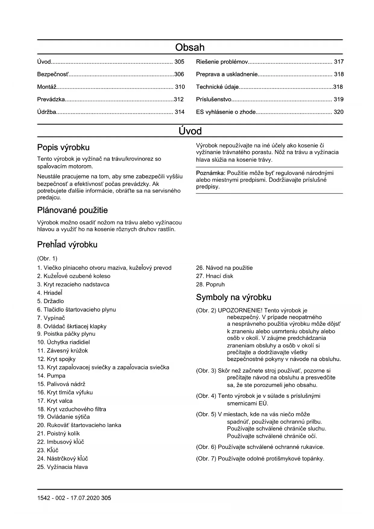 Symboly na výrobku (Obr. 2) UPOZORNENIE! Tento výrobok je nebezpečný. V prípade neopatrného a nesprávneho použitia výrobku môže dôjsť k zraneniu alebo usmrteniu obsluhy alebo osôb v okolí. V záujme predchádzania zraneniam obsluhy a osôb v okolí si prečítajte a dodržiavajte všetky bezpečnostné pokyny v návode na obsluhu. (Obr. 3) Skôr než začnete stroj používať, pozorne si prečítajte návod na obsluhu a presvedčite sa, že ste porozumeli jeho obsahu. (Obr. 4) Tento výrobok je v súlade s príslušnými smernicami EÚ. (Obr. 5) V miestach, kde na vás niečo môže spadnúť, používajte ochrannú prilbu. Používajte schválené chrániče sluchu. Používajte schválené chrániče očí. (Obr. 6) Používajte schválené ochranné rukavice. (Obr. 7) Používajte odolné protišmykové topánky. 1542 - 002 - 17.07.2020 305(Obr. 8) Počas používania sa môžu od výrobku odraziť predmety a spôsobiť poranenie. (Obr. 9) Maximálne otáčky výstupného hriadeľa. (Obr. 10) Počas používania výrobku zachovávajte minimálnu vzdialenosť 15 metrov od ľudí a zvierat. (Obr. 11) V prípade, že sa rezné zariadenie dotkne predmetu, ktorý nie je možné priamo prerezať, hrozí riziko odrazenia noža. Výrobok je schopný odrezať časť tela. Počas používania výrobku zachovávajte minimálnu vzdialenosť 15 metrov od ľudí a zvierat. (Obr. 12) Balónik pumpy. (Obr. 13) Smer zatvorenia sýtiča. (Obr. 14) Smer otvorenia sýtiča. (Obr. 15) Emisie hluku do okolia podľa európskej smernice 2000/14/ES a legislatívy v štáte New South Wales „Protection of the Environment Operations (Noise Control) Regulation 2017“ (Nariadenie o ochrane životného prostredia pri prevádzke (kontrola hluku) z roku 2017). Údaje o emisiách hluku možno nájsť na štítku stroja a v kapitole Technické údaje