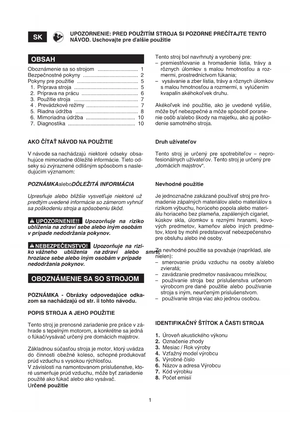 UPOZORNENIE: PRED POUŽITÍM STROJA SI POZORNE PREČÍTAJTE TENTO NÁVOD. Uschovajte pre ďalšie použitie Tento stroj bol navrhnutý a vyrobený pre: – premiestňovanie a hromadenie lístia, trávy a rôznych úlomkov s malou hmotnosťou a roz- mermi, prostredníctvom fúkania; – vysávanie a zber lístia, trávy a rôznych úlomkov s malou hmotnosťou a rozmermi, s vylúčením kvapalín akéhokoľvek druhu. Akékoľvek iné použitie, ako je uvedené vyššie, môže byť nebezpečné a môže spôsobiť porane- nie osôb a/alebo škody na majetku, ako aj poško- denie samotného stroja. Druh užívateľov Tento stroj je určený pre spotrebiteľov – nepro- fesionálnych užívateľov. Tento stroj je určený pre „domácich majstrov“. Nevhodné použitie Je jednoznačne zakázané používať stroj pre hro- madenie zápalných materiálov alebo materiálov s rizikom výbuchu, horúceho popola alebo materi- álu horiaceho bez plameňa, zapálených cigariet, kúskov skla, úlomkov s reznými hranami, kovo- vých predmetov, kameňov alebo iných predme- tov, ktoré by mohli predstavovať nebezpečenstvo pre obsluhu alebo iné osoby. Za nevhodné použitie sa považuje (napríklad, ale nielen): – smerovanie prúdu vzduchu na osoby a/alebo zvieratá; – zavádzanie predmetov nasávacou mriežkou; – používanie stroja bez príslušenstva určenom výrobcom pre dané použitie alebo používanie stroja s iným, neurčeným príslušenstvom. – používanie stroja viac ako jednou osobou. IDENTIFIKAČNÝ ŠTÍTOK A ČASTI STROJA