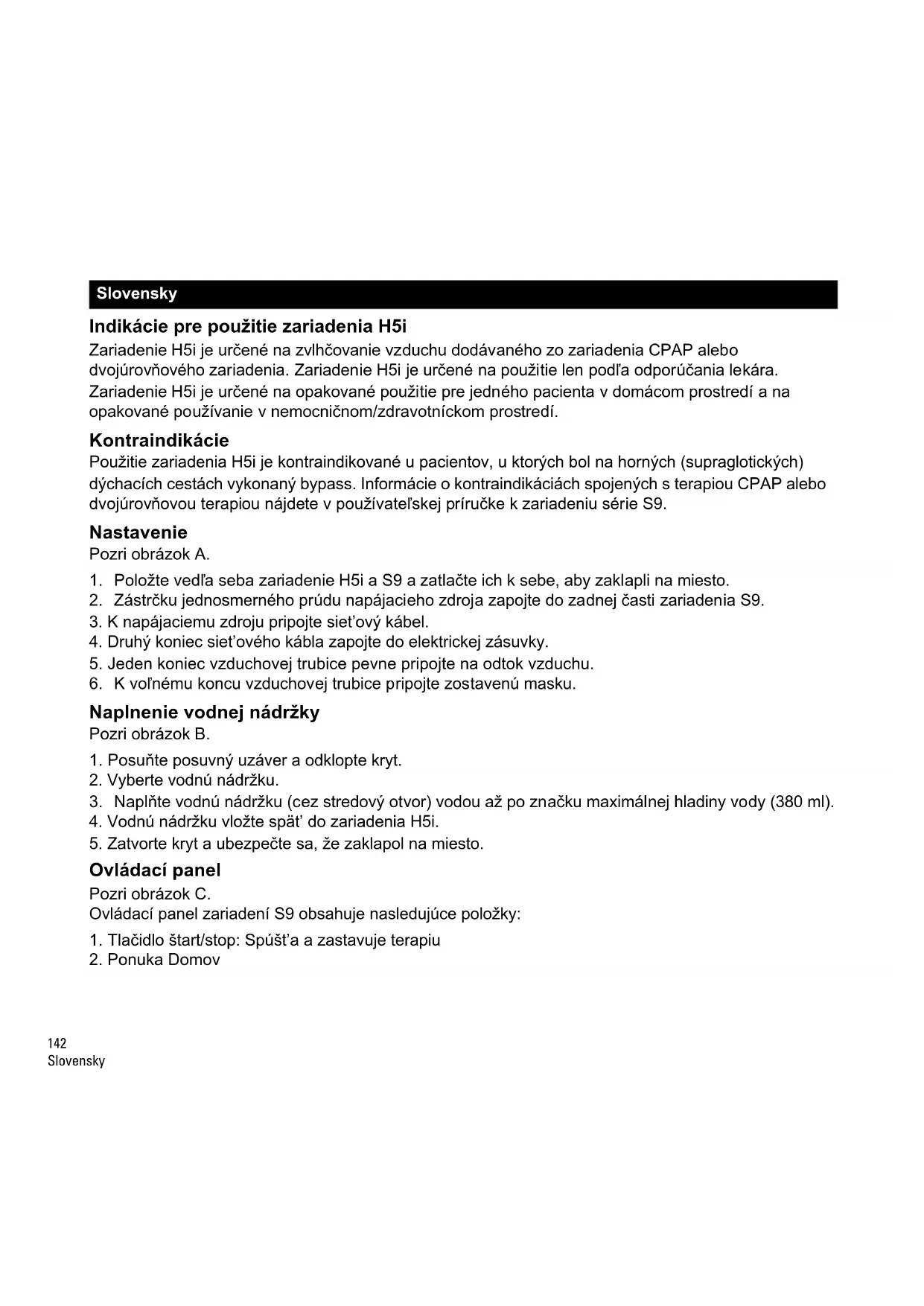 Indikácie pre použitie zariadenia H5i Zariadenie H5i je určené na zvlhčovanie vzduchu dodávaného zo zariadenia CPAP alebo dvojúrovňového zariadenia. Zariadenie H5i je určené na použitie len podľa odporúčania lekára. Zariadenie H5i je určené na opakované použitie pre jedného pacienta v domácom prostredí a na opakované používanie v nemocničnom/zdravotníckom prostredí. Kontraindikácie Použitie zariadenia H5i je kontraindikované u pacientov, u ktorých bol na horných (supraglotických) dýchacích cestách vykonaný bypass. Informácie o kontraindikáciách spojených s terapiou CPAP alebo dvojúrovňovou terapiou nájdete v používateľskej príručke k zariadeniu série S9. Nastavenie Pozri obrázok A.