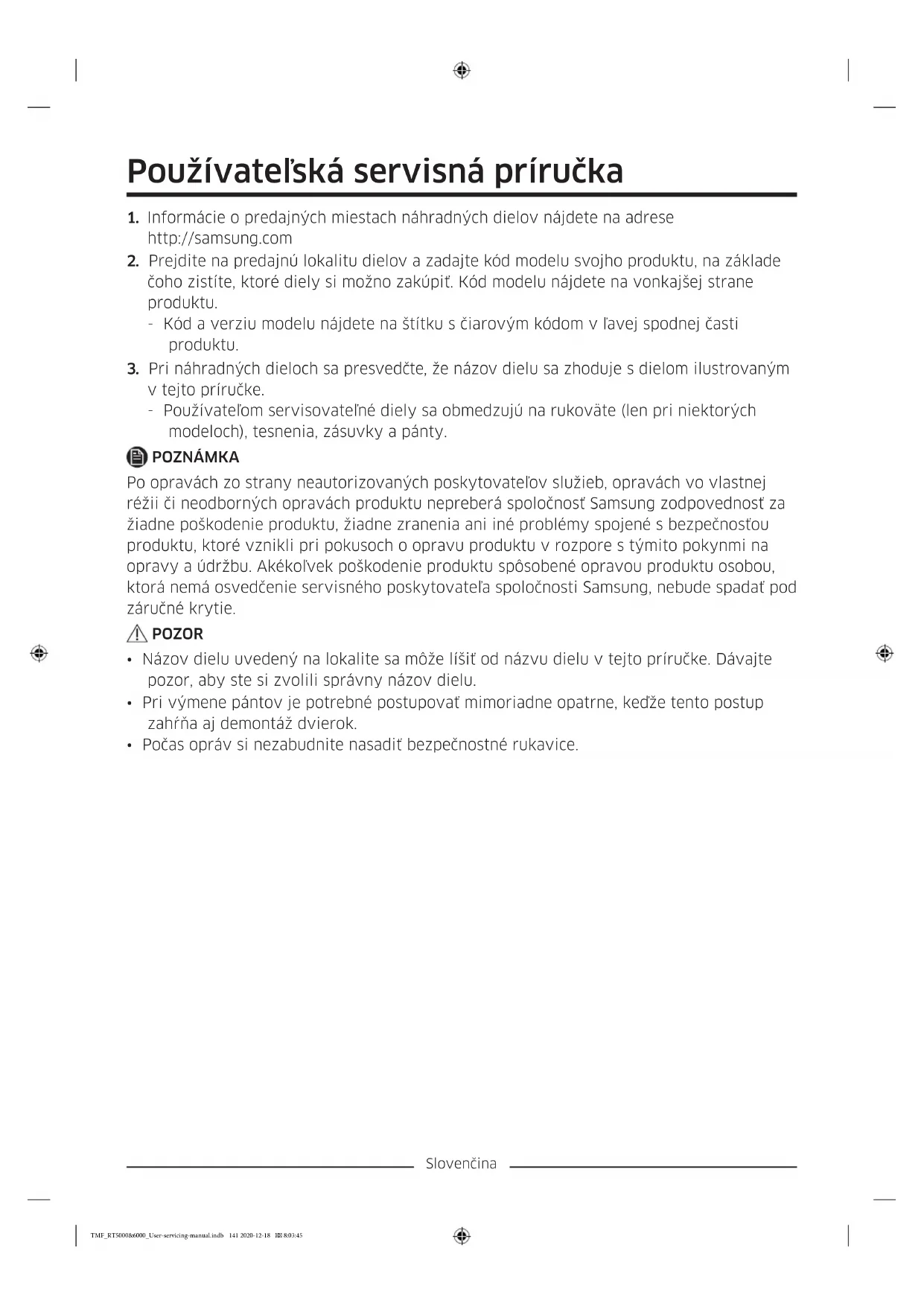 v tejto príručke. - Používateľom servisovateľné diely sa obmedzujú na rukoväte (len pri niektorých modeloch), tesnenia, zásuvky a pánty. POZNÁMKA Po opravách zo strany neautorizovaných poskytovateľov služieb, opravách vo vlastnej réžii či neodborných opravách produktu nepreberá spoločnosť Samsung zodpovednosť za žiadne poškodenie produktu, žiadne zranenia ani iné problémy spojené s bezpečnosťou produktu, ktoré vznikli pri pokusoch o opravu produktu v rozpore s týmito pokynmi na opravy a údržbu. Akékoľvek poškodenie produktu spôsobené opravou produktu osobou, ktorá nemá osvedčenie servisného poskytovateľa spoločnosti Samsung, nebude spadať pod záručné krytie. POZOR