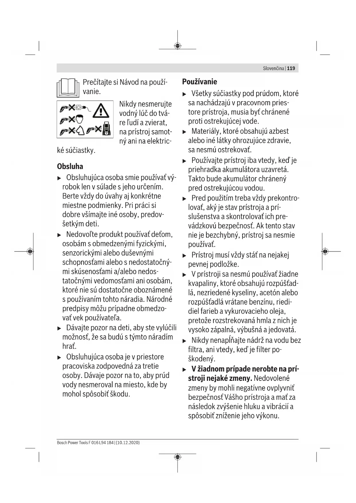 Stroj vypněte a stiskněte spoušť, aby se vyprázdnila voda v hadici. Uvolněte hadici ze stříkací pistole a výpustě vody. Stříkací pistoli, kartáč a hadici lze uložit na stroji. Vyprázdněte vodu ze systému a odstraňte akumulátor. Filtr pravidelně čistěte. Péče o akumulátor Pro zaručení optimálního používání akumulátoru dbejte následujících upozornění a opatření: – Chraňte akumulátor před vlhkostí a vodou. – Zahradní nářadí a akumulátor skladujte pouze v teplotním rozsahu od –20 °C do 50 °C. Nenechávejte zahradní nářadí např. v létě ležet v autě. – Akumulátor uskladněte odděleně a nikoli v nabíječce. – Při přímém slunečním záření nenechávejte akumulátor v zahradním nářadí. – Optimální teplota pro uskladnění akumulátoru činí 5 °C. – Příležitostně vyčistěte větrací otvory akumulátoru měkkým, čistým a suchým štětcem. Výrazně zkrácená doba provozu po nabití ukazuje, že je akumulátor opotřebovaný a musí se nahradit. Zákaznická služba aporadenství ohledně použití Zákaznická služba zodpoví vaše dotazy kopravě aúdržbě vašeho výrobku atéž knáhradním dílům. Rozkladové výkresy ainformace onáhradních dílech najdete také na: www.bosch-pt.com. Vpřípadě dotazů knašim výrobkům apříslušenství vám ochotně pomůže poradenský tým Bosch. Vpřípadě veškerých otázek aobjednávek náhradních dílů bezpodmínečně uveďte 10místné věcné číslo podle typového štítku výrobku. Czech Republic Robert Bosch odbytová s.r.o. Bosch Service Center PT K Vápence 1621/16 692 01 Mikulov Na www.bosch-pt.cz si si můžete objednat opravu Vašeho stroje nebo náhradní díly online. Tel.: +420 519 305700 Fax: +420 519 305705 E-Mail: servis.naradi@cz.bosch.com www.bosch-pt.cz Další adresy servisů najdete na: www.bosch-pt.com/serviceaddresses Přeprava Obsažené lithium-iontové akumulátory podléhají požadavkům zákona onebezpečných nákladech. Tyto akumulátory mohou být bez dalších podmínek přepravovány uživatelem po silnici. Při zasílání prostřednictvím třetí osoby (např.: letecká přeprava nebo spedice) je třeba brát zřetel na zvláštní požadavky na balení aoznačení. Zde musí být při přípravě zásilky nezbytně přizván expert na nebezpečné náklady. Akumulátory zasílejte pouze tehdy, pokud není poškozený kryt. Otevřené kontakty přelepte lepicí páskou aakumulátor zabalte tak, aby se vobalu nemohl pohybovat. Dodržujte také případné další národní předpisy. Likvidace Výrobky, akumulátory, příslušenství a obaly mají být dodány k opětovnému zhodnocení nepoškozujícímu životní prostředí. Výrobky aakumulátory/baterie nevyhazujte do domovního odpadu! Pouze pro zeměEU: Podle evropské směrnice 2012/19/EU musejí být neupotřebitelné výrobky a podle evropské směrnice 2006/66/ES vadné nebo opotřebované akumulátory/ baterie odděleně shromážděny a dodány k opětovnému zhodnocení nepoškozujícímu životní prostředí. Akumulátory/baterie: Lithium-iontové: Dodržujte pokyny uvedené včásti Přeprava (viz „Přeprava“, Stránka118). Slovenčina Bezpečnostné pokyny u Varovanie! Prečítajte si všetky bezpečnostné pokyny a upozorne- nia. Nedostatočné dodržiavanie bez- pečnostných predpisov a pokynov môže mať za následok zásah elektric- kým prúdom, požiar, alebo spôsobiť vážne poranenia. Vysvetlenie symbolov na prístroji Všeobecné upozornenie na nebezpečenstvo F 016 L94 184 | (10.12.2020) Bosch Power ToolsSlovenčina | 119 Prečítajte si Návod na použí- vanie. Nikdy nesmerujte vodný lúč do tvá- re ľudí a zvierat, na prístroj samot- ný ani na elektric- ké súčiastky. Obsluha u Obsluhujúca osoba smie používať vý- robok len v súlade s jeho určením. Berte vždy do úvahy aj konkrétne miestne podmienky. Pri práci si dobre všímajte iné osoby, predov- šetkým deti. u Nedovoľte produkt používať deťom, osobám s obmedzenými fyzickými, senzorickými alebo duševnými schopnosťami alebo s nedostatočný- mi skúsenosťami a/alebo nedos- tatočnými vedomosťami ani osobám, ktoré nie sú dostatočne oboznámené s používaním tohto náradia. Národné predpisy môžu prípadne obmedzo- vať vek používateľa. u Dávajte pozor na deti, aby ste vylúčili možnosť, že sa budú s týmto náradím hrať. u Obsluhujúca osoba je v priestore pracoviska zodpovedná za tretie osoby. Dávaje pozor na to, aby prúd vody nesmeroval na miesto, kde by mohol spôsobiť škodu. Používanie u Všetky súčiastky pod prúdom, ktoré sa nachádzajú v pracovnom pries- tore prístroja, musia byť chránené proti ostrekujúcej vode. u Materiály, ktoré obsahujú azbest alebo iné látky ohrozujúce zdravie, sa nesmú ostrekovať. u Používajte prístroj iba vtedy, keď je priehradka akumulátora uzavretá. Takto bude akumulátor chránený pred ostrekujúcou vodou. u Pred použitím treba vždy prekontro- lovať, aký je stav prístroja a prí- slušenstva a skontrolovať ich pre- vádzkovú bezpečnosť. Ak tento stav nie je bezchybný, prístroj sa nesmie používať. u Prístroj musí vždy stáť na nejakej pevnej podložke. u V prístroji sa nesmú používať žiadne kvapaliny, ktoré obsahujú rozpúšťad- lá, nezriedené kyseliny, acetón alebo rozpúšťadlá vrátane benzínu, riedi- diel farieb a vykurovacieho oleja, pretože rozstrekovaná hmla z nich je vysoko zápalná, výbušná a jedovatá. u Nikdy nenapĺňajte nádrž na vodu bez filtra, ani vtedy, keď je filter po- škodený. u V žiadnom prípade nerobte na prí- stroji nejaké zmeny. Nedovolené zmeny by mohli negatívne ovplyvniť bezpečnosť Vášho prístroja a mať za následok zvýšenie hluku a vibrácií a spôsobiť zníženie jeho výkonu. Bosch Power Tools F 016 L94 184 | (10.12.2020)120 | Slovenčina u Nesmeruj