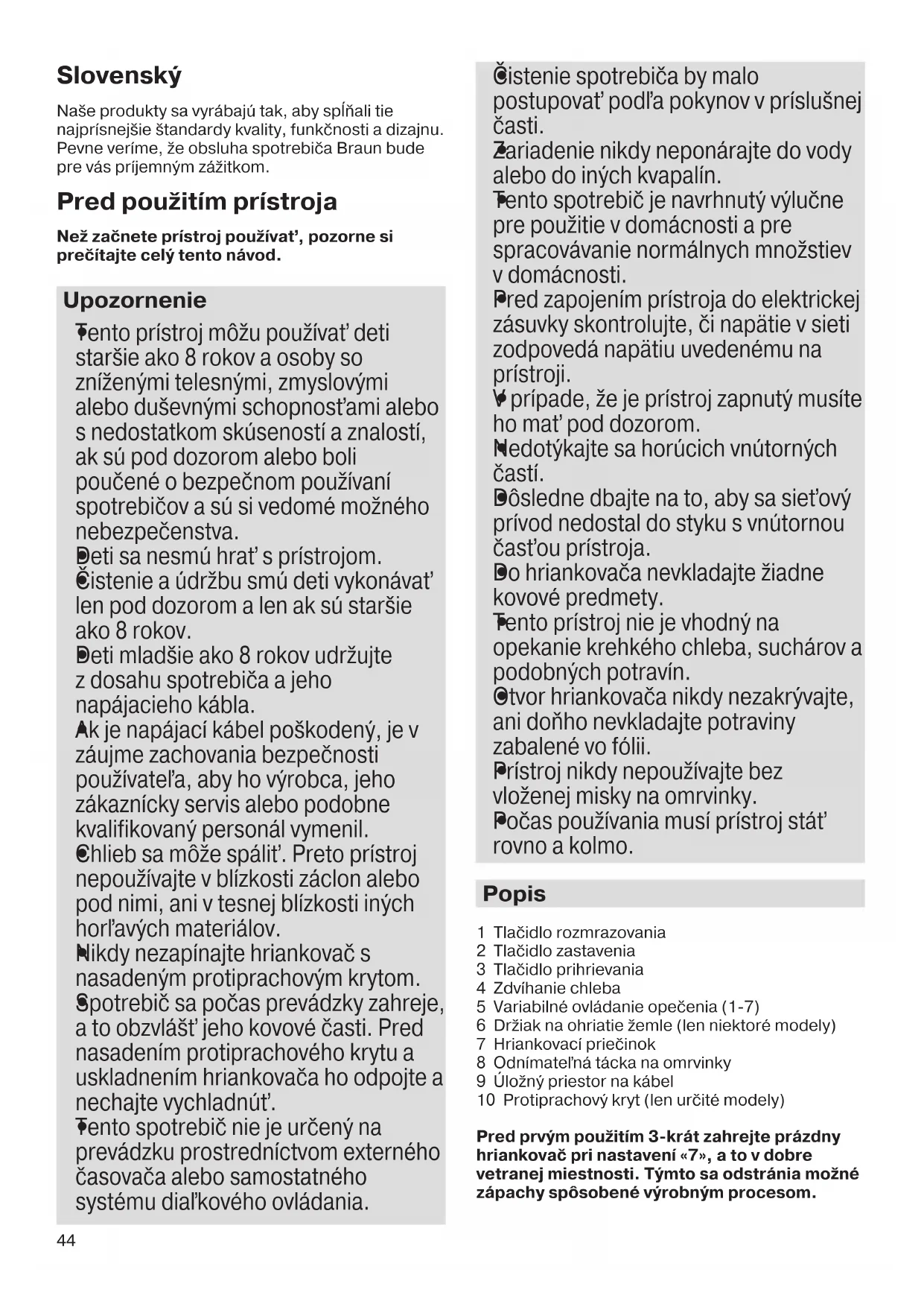 Tento prístroj nie je vhodný na opekanie krehkého chleba, suchárov a podobných potravín.