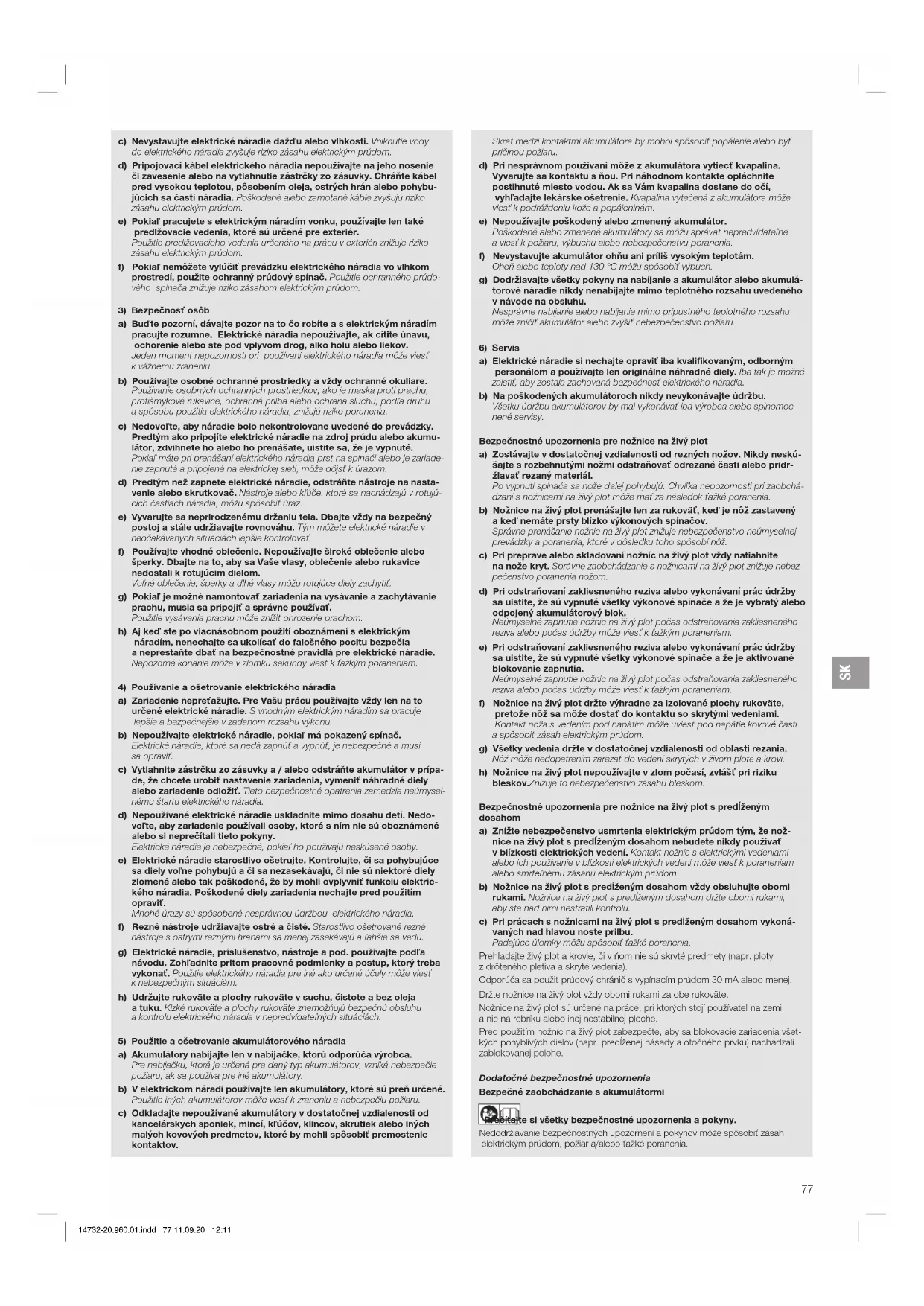 Nebezpečenstvo – Nepribližujte sa rukami k reznému nožu. Nevystavujte pôsobeniu dažďa. Pre nabíjačku: V prípade, že je vedenie poškodené alebo prerušené, odpojte okamžite zástrčku od siete.