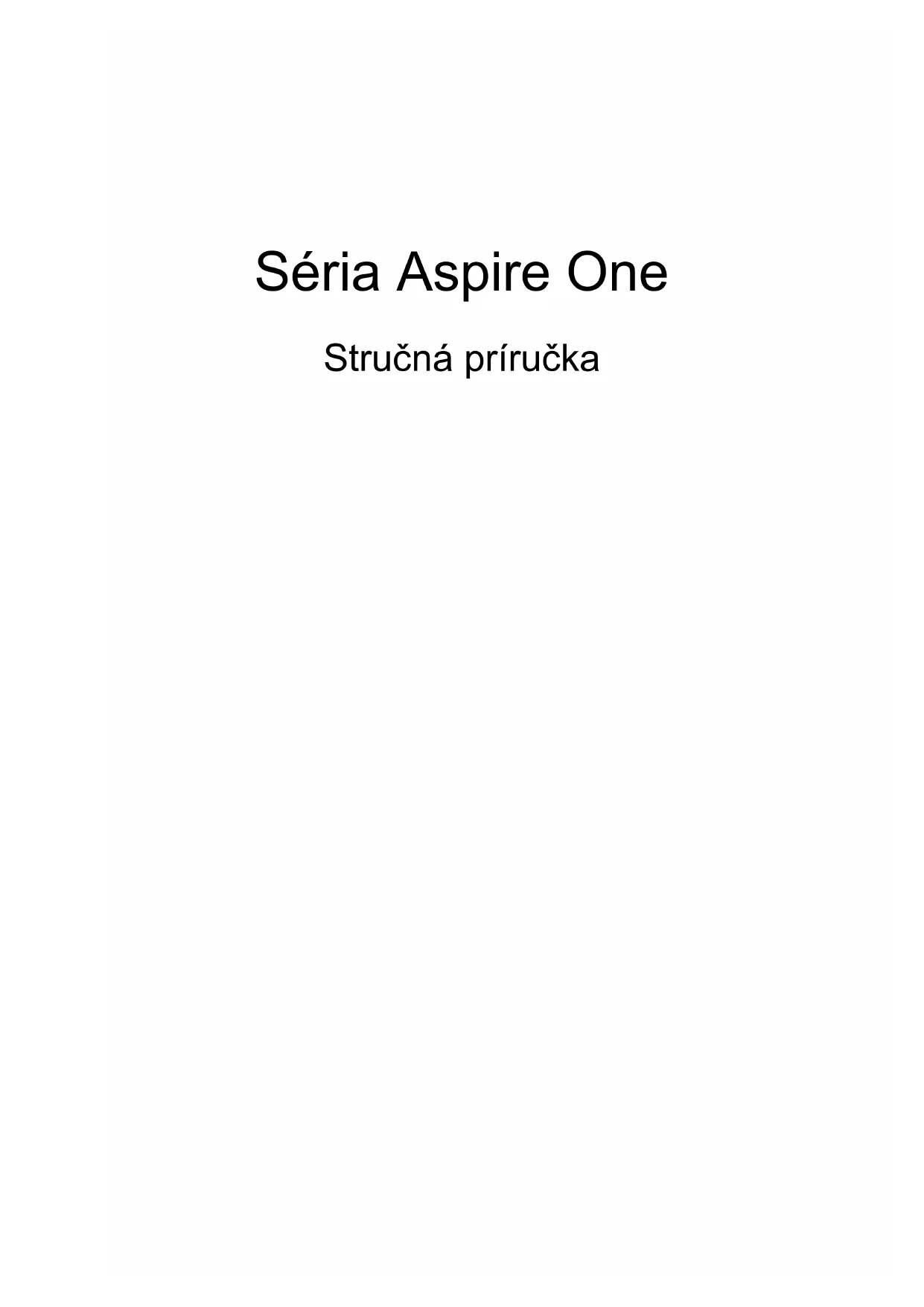 - Neprovozní: 20% až 80%Séria Aspire One Stručná príručkaČíslo modelu: __________________________________ Sériové číslo: __________________________________ Dátum zakúpenia: ______________________________ Miesto zakúpenia: ______________________________ © 2010 Všetky práva vyhradené. Stručná príručka pre sériu Aspire One Pôvodné vydanie: 11/2010 Prenosný počítač série Aspire One3 Hneď na úvod Radi by sme vám poďakovali za rozvoj prenosných počítačov série Acer - vašej voľby pre vaše mobilné počítačové potreby. Vaše príručky Aby sme vám pomohli s používaním Acer, vytvorili sme pre vás sadu príručiek: V prvom rade plagát Práve začíname..., ktorý vám pomôže začat’ s nastavením vášho počítača. Všeobecná používateľská príručka pre sériu Aspire One obsahuje užitočné informácie týkajúce sa všetkých modelov v produktovom rade Aspire One. Obsahuje základné témy, ako napríklad informácie o používaní klávesnice, zvuku atď. Majte teda na pamäti, že Všeobecná používateľská príručka ako aj AcerSystem User Guide, ktorá je spomenutá ďalej, občas obsahujú informácie o funkciách a vlastnostiach, ktorými sú vybavené iba určité modely produktovej série a model, ktorý si zakúpili, nimi nemusí byt’ vybavený. Opis takýchto funkcií je v texte označený poznámkou v zmysle „len pre určité modely“. Stručná príručka sú základné funkcie a vlastnosti vášho nového počítača. Informácie o tom, ako vám počítač pomôže byt’ produktívnejší, nájdete v AcerSystem User Guide. Táto príručka obsahuje podrobné informácie o systémových programoch, obnove dát, možnostiach rozšírenia a riešenie problémov. Okrem toho obsahuje informácie o záruke a všeobecné vyhlásenia k predpisom a bezpečnosti. Je dostupná vo formáte PDF a je umiestnená vo vašom prenosnom počítači. Ak si chcete pozriet’ jej obsah, postupujte podľa nasledovných krokov: 1 Kliknite na Štart > Všetky programy > AcerSystem. 2 Kliknite na AcerSystem User Guide. Poznámka: Prezeranie súboru vyžaduje Adobe Reader. Ak na vašom počítači nie je Adobe Reader nainštalovaný, kliknutím na AcerSystem User Guide sa najprv spustí inštalácia programu Adobe Reader. Inštaláciu dokončíte podľa inštrukcií, ktoré uvidíte na obrazovke. Inštrukcie ako používat’ Adobe Reader nájdete v menu Pomocník a Podpora.4 Slovenčina Zoznámte sa s vašim prenosným počítačom Acer Po nastavení počítača podľa letáku o nastavení nám dovoľte, aby sme vás zoznámili s vaším novým prenosným počítačom Acer. Pohľad zhora # Ikona Položka Popis1 Mikrofón Interný mikrofón na nahrávanie zvuku.2 Obrazovka Nazýva sa tiež Liquid-Crystal Display (LCD), zobrazuje výstup z počítača (konfigurácia sa môže v závislosti od modelu líšit’).