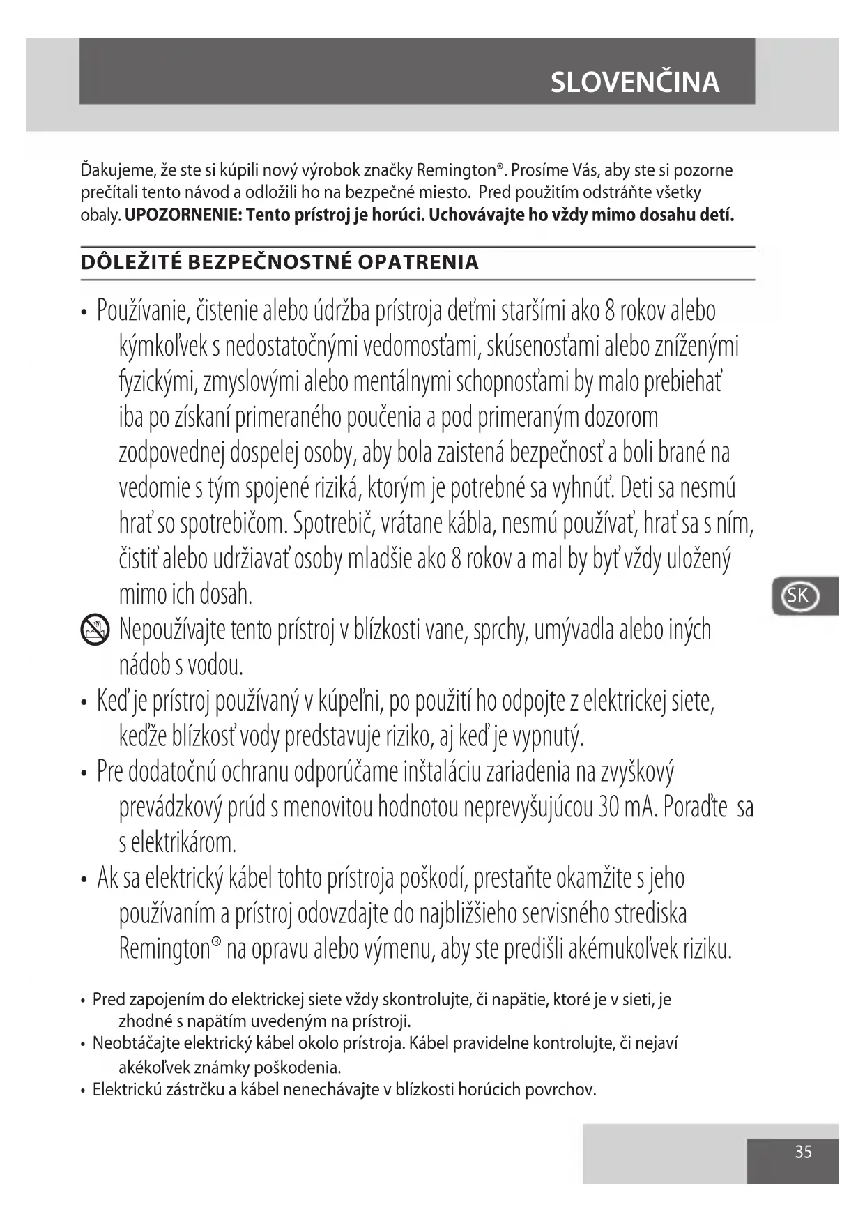 - Ak sa elektrický kábel tohto prístroja poškodí, prestaňte okamžite s jeho používaním a prístroj odovzdajte do najbližšieho servisného strediska Remington® na opravu alebo výmenu, aby ste predišli akémukoľvek riziku.
