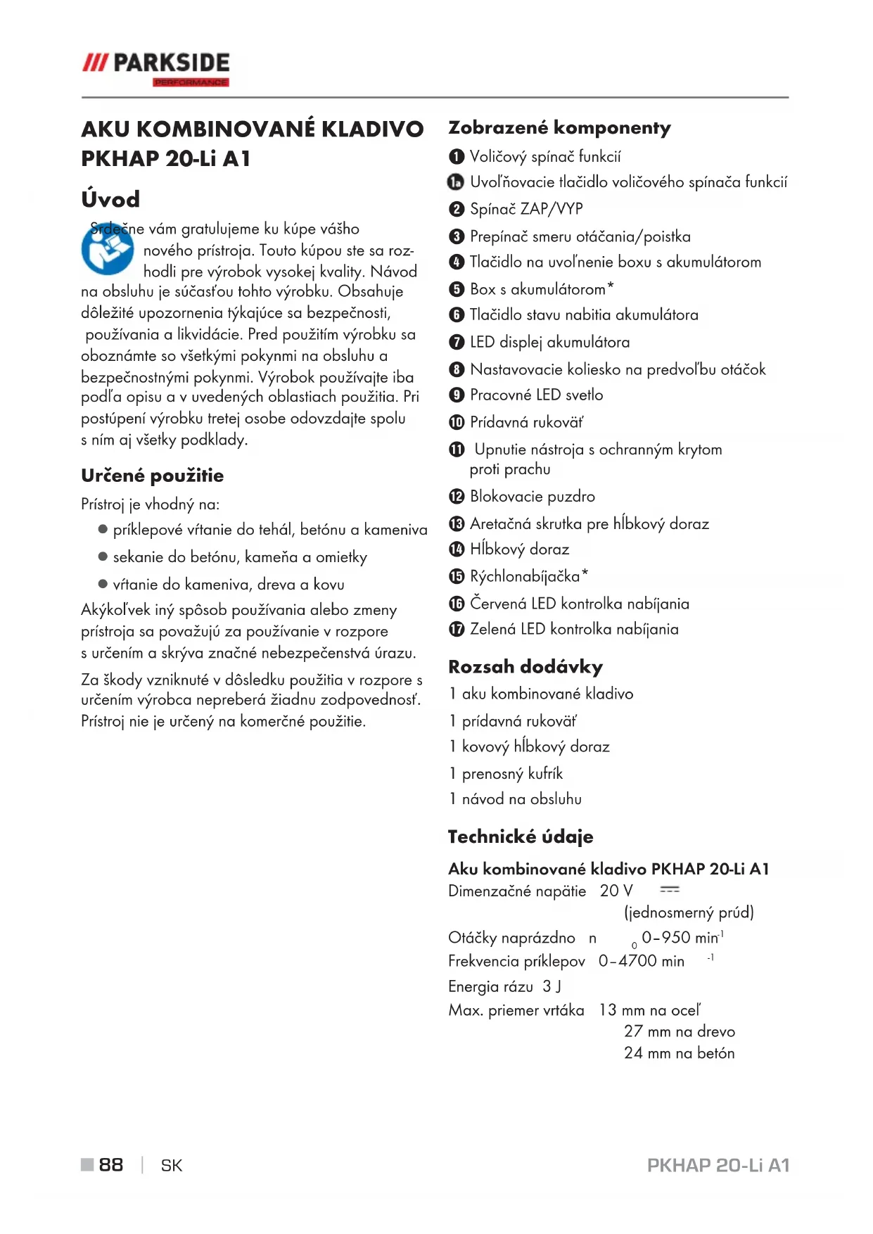 PKHAP 20-Li A1 Úvod Srdečne vám gratulujeme kukúpe vášho nového prístroja. Touto kúpou ste sa roz- hodli pre výrobok vysokej kvality. Návod na obsluhu je súčasťou tohto výrobku. Obsahuje dôležité upozornenia týkajúce sa bezpečnosti, používania a likvidácie. Pred použitím výrobku sa oboznámte sovšetkými pokynmi na obsluhu a bezpečnostnými pokynmi. Výrobok používajte iba podľa opisu a vuvedených oblastiach použitia. Pri postúpení výrobku tretej osobe odovzdajte spolu sním aj všetky podklady. Určené použitie Prístroj je vhodný na: ▯ príklepové vŕtanie do tehál, betónu a kameniva ▯ sekanie do betónu, kameňa a omietky ▯ vŕtanie do kameniva, dreva a kovu Akýkoľvek iný spôsob používania alebo zmeny prístroja sa považujú za používanie v rozpore surčením a skrýva značné nebezpečenstvá úrazu. Za škody vzniknuté v dôsledku použitia v rozpore s určením výrobca nepreberá žiadnu zodpovednosť. Prístroj nie je určený na komerčné použitie. Zobrazené komponenty Voličový spínač funkcií Uvoľňovacie tlačidlo voličového spínača funkcií Spínač ZAP/VYP Prepínač smeru otáčania/poistka Tlačidlo na uvoľnenie boxu s akumulátorom Box s akumulátorom* Tlačidlo stavu nabitia akumulátora LED displej akumulátora Nastavovacie koliesko na predvoľbu otáčok Pracovné LED svetlo Prídavná rukoväť - Upnutie nástroja s ochranným krytom proti prachu 3 Blokovacie puzdro ! Aretačná skrutka pre hĺbkový doraz . Hĺbkový doraz 0 Rýchlonabíjačka* 6 Červená LED kontrolka nabíjania 1 Zelená LED kontrolka nabíjania Rozsah dodávky 1 aku kombinované kladivo 1 prídavná rukoväť 1 kovový hĺbkový doraz 1 prenosný kufrík 1 návod na obsluhu Technické údaje Aku kombinované kladivo PKHAP 20-Li A1 Dimenzačné napätie 20 V (jednosmerný prúd) Otáčky naprázdno n