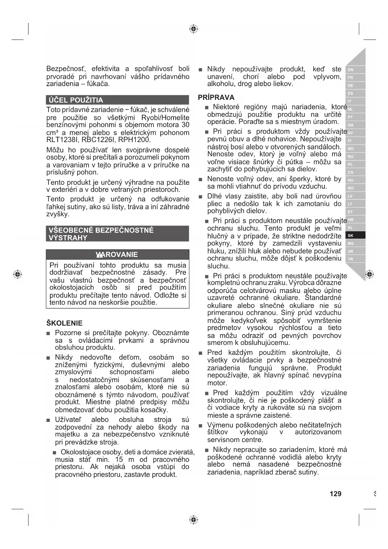 VÝSTRAHY VAROVANIE Pri používaní tohto produktu sa musia dodržiavať bezpečnostné zásady. Pre vašu vlastnú bezpečnosť a bezpečnosť okolostojacich osôb si pred použitím produktu prečítajte tento návod. Odložte si tento návod na neskoršie použitie. ŠKOLENIE ■ Pozorne si prečítajte pokyny. Oboznámte sa s ovládacími prvkami a správnou obsluhou produktu. ■ Nikdy nedovoľte deťom, osobám so zníženými fyzickými, duševnými alebo zmyslovými schopnosťami alebo s nedostatočnými skúsenosťami a znalosťami alebo osobám, ktoré nie sú oboznámené s týmto návodom, používať produkt. Miestne platné predpisy môžu obmedzovať dobu použitia kosačky. ■ Užívateľ alebo obsluha stroja sú zodpovední za nehody alebo škody na majetku a za nebezpečenstvo vzniknuté pri prevádzke stroja. ■ Okolostojace osoby, deti a domáce zvieratá, musia stáť min. 15 m od pracovného priestoru. Ak nejaká osoba vstúpi do pracovného priestoru, zastavte produkt. ■ Nikdy nepoužívajte produkt, keď ste unavení, chorí alebo pod vplyvom, alkoholu, drog alebo liekov. PRÍPRAVA ■ Niektoré regióny majú nariadenia, ktoré obmedzujú použitie produktu na určité operácie. Poraďte sa s miestnym úradom. ■ Pri práci s produktom vždy používajte pevnú obuv a dlhé nohavice. Nepoužívajte nástroj bosí alebo v otvorených sandáloch. Nenoste odev, ktorý je voľný alebo má voľne visiace šnúrky či pútka – môžu sa zachytiť do pohybujúcich sa dielov. ■ Nenoste voľný odev, ani šperky, ktoré by sa mohli vtiahnuť do prívodu vzduchu. ■ Dlhé vlasy zaistite, aby boli nad úrovňou pliec a nedošlo tak k ich zamotaniu do pohyblivých dielov. ■ Pri práci s produktom neustále používajte ochranu sluchu. Tento produkt je veľmi hlučný a v prípade, že striktne nedodržíte pokyny, ktoré by zamedzili vystaveniu hluku, znížili hluk alebo nebudete používať ochranu sluchu, môže dôjsť k poškodeniu sluchu. ■ Pri práci s produktom neustále používajte kompletnú ochranu zraku. Výrobca dôrazne odporúča celotvárovú masku alebo úplne uzavreté ochranné okuliare. Štandardné okuliare alebo slnečné okuliare nie sú primeranou ochranou. Siný prúd vzduchu môže kedykoľvek spôsobiť vymrštenie predmetov vysokou rýchlosťou a tieto sa môžu odraziť od pevných povrchov smerom k obsluhujúcemu. ■ Pred každým použitím skontrolujte, či všetky ovládacie prvky a bezpečnostné zariadenia fungujú správne. Produkt nepoužívajte, ak hlavný spínač nevypína motor. ■ Pred každým použitím vždy vizuálne skontrolujte, či nie je poškodený plášť a či vodiace kryty a rukoväte sú na svojom mieste a správne zaistené. ■ Výmenu poškodených alebo nečitateľných štítkov vykonajú v autorizovanom servisnom centre. ■ Nikdy nepracujte so zariadením, ktoré má poškodené ochranné vodidlá alebo kryty alebo nemá nasadené bezpečnostné zariadenia, napríklad zberač sutiny.130 | Slovenčina