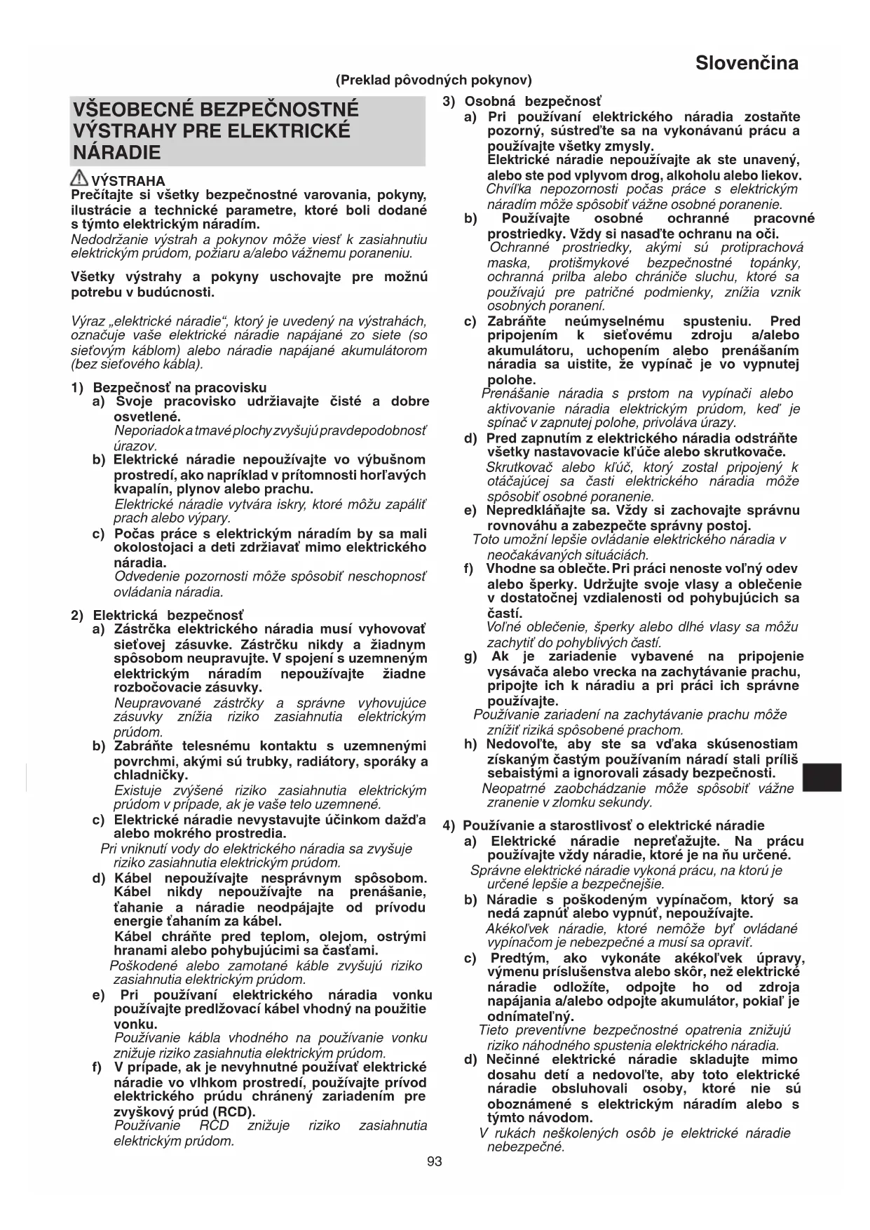 NÁRADIE VÝSTRAHA Prečítajte si všetky bezpečnostné varovania, pokyny, ilustrácie a technické parametre, ktoré boli dodané s týmto elektrickým náradím. Nedodržanie výstrah a pokynov môže viesť k zasiahnutiu elektrickým prúdom, požiaru a/alebo vážnemu poraneniu. Všetky výstrahy a pokyny uschovajte pre možnú potrebu v budúcnosti. Výraz „elektrické náradie“, ktorý je uvedený na výstrahách, označuje vaše elektrické náradie napájané zo siete (so sieťovým káblom) alebo náradie napájané akumulátorom (bez sieťového kábla).