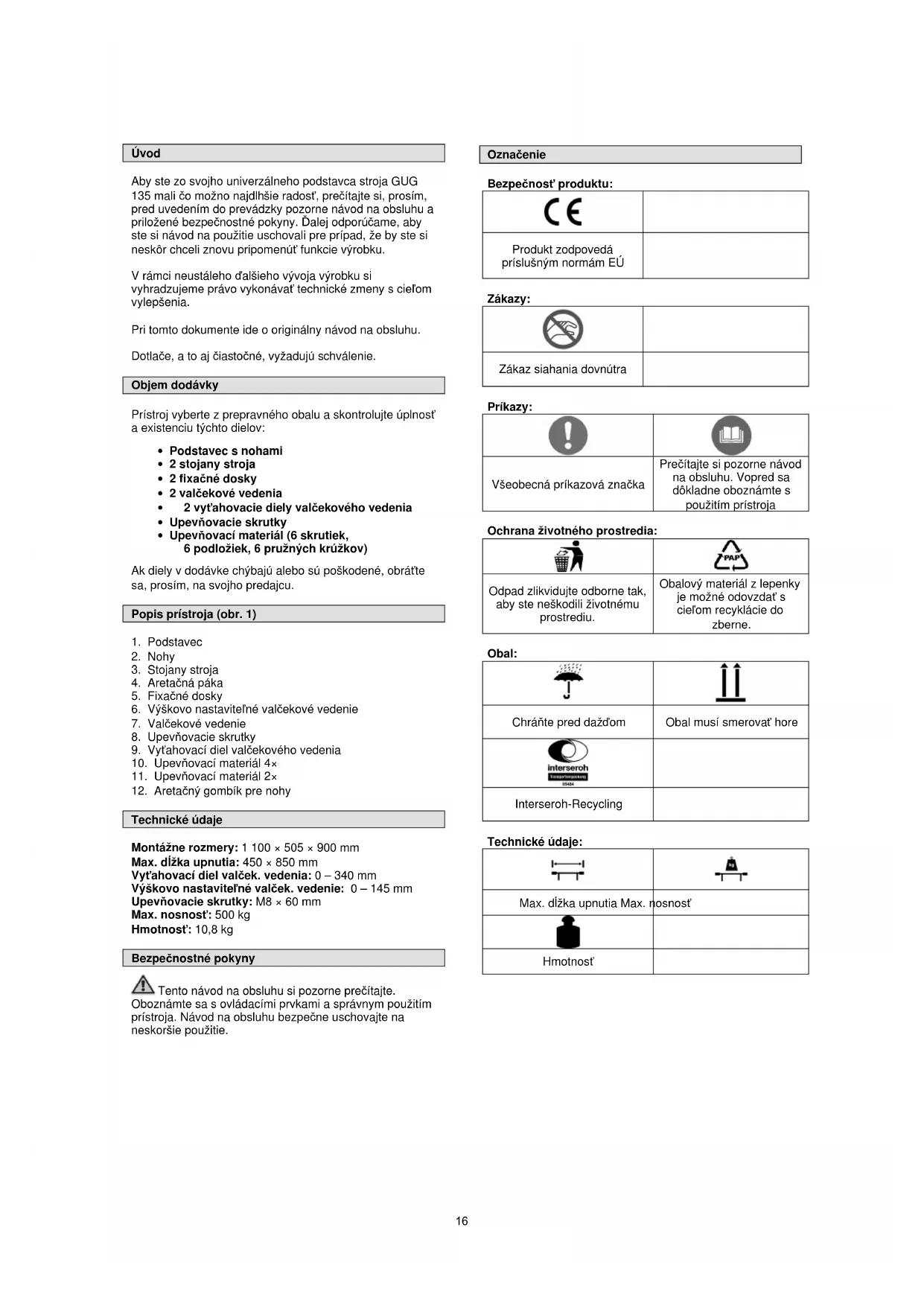 Obj. č.: #94713 Příslušné směrnice EU: 20006/42 EG Datum/podpis výrobce: 12.12.2011 Údaje o podepsaném: jednatel pan Arnold Technická dokumentace: J. Bürkle FBL; QS 15Úvod Aby ste zo svojho univerzálneho podstavca stroja GUG 135 mali čo možno najdlhšie radosť, prečítajte si, prosím, pred uvedením do prevádzky pozorne návod na obsluhu a priložené bezpečnostné pokyny. Ďalej odporúčame, aby ste si návod na použitie uschovali pre prípad, že by ste si neskôr chceli znovu pripomenúť funkcie výrobku. V rámci neustáleho ďalšieho vývoja výrobku si vyhradzujeme právo vykonávať technické zmeny s cieľom vylepšenia. Pri tomto dokumente ide o originálny návod na obsluhu. Dotlače, a to aj čiastočné, vyžadujú schválenie. Objem dodávky Prístroj vyberte z prepravného obalu a skontrolujte úplnosť a existenciu týchto dielov:
