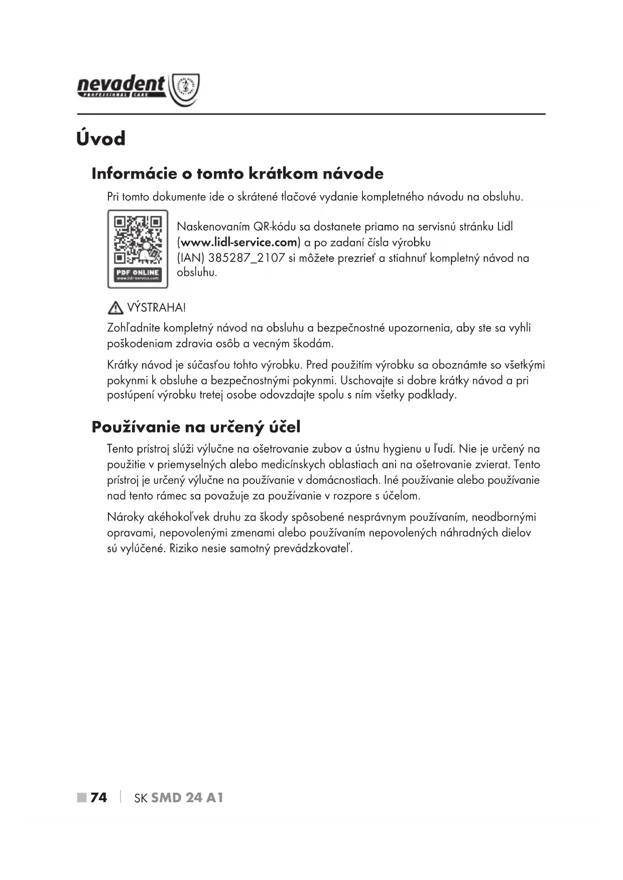 Úvod Informácie o tomto krátkom návode Pri tomto dokumente ide o skrátené tlačové vydanie kompletného návodu na obsluhu. Naskenovaním QR-kódu sa dostanete priamo na servisnú stránku Lidl (www.lidl-service.com) a po zadaní čísla výrobku (IAN) 385287_2107 si môžete prezrieť a stiahnuť kompletný návod na obsluhu. VÝSTRAHA! Zohľadnite kompletný návod na obsluhu a bezpečnostné upozornenia, aby ste sa vyhli poškodeniam zdravia osôb a vecným škodám. Krátky návod je súčasťou tohto výrobku. Pred použitím výrobku sa oboznámte sovšetkými pokynmi k obsluhe a bezpečnostnými pokynmi. Uschovajte si dobre krátky návod a pri postúpení výrobku tretej osobe odovzdajte spolu sním všetky podklady. Používanie na určený účel Tento prístroj slúži výlučne na ošetrovanie zubov a ústnu hygienu u ľudí. Nie je určený na použitie v priemyselných alebo medicínskych oblastiach ani na ošetrovanie zvierat. Tento prístroj je určený výlučne na používanie vdomácnostiach. Iné používanie alebo používanie nad tento rámec sapovažuje zapoužívanie v rozpore súčelom. Nároky akéhokoľvek druhu za škody spôsobené nesprávnym používaním, neodbornými opravami, nepovolenými zmenami alebo používaním nepovolených náhradných dielov sú vylúčené. Riziko nesie samotný prevádzkovateľ. IB_385287_SMD24A1_LB8-short.indb 74IB_385287_SMD24A1_LB8-short.indb 74 27.10.2021 11:37:2727.10.2021 11:37:27SK