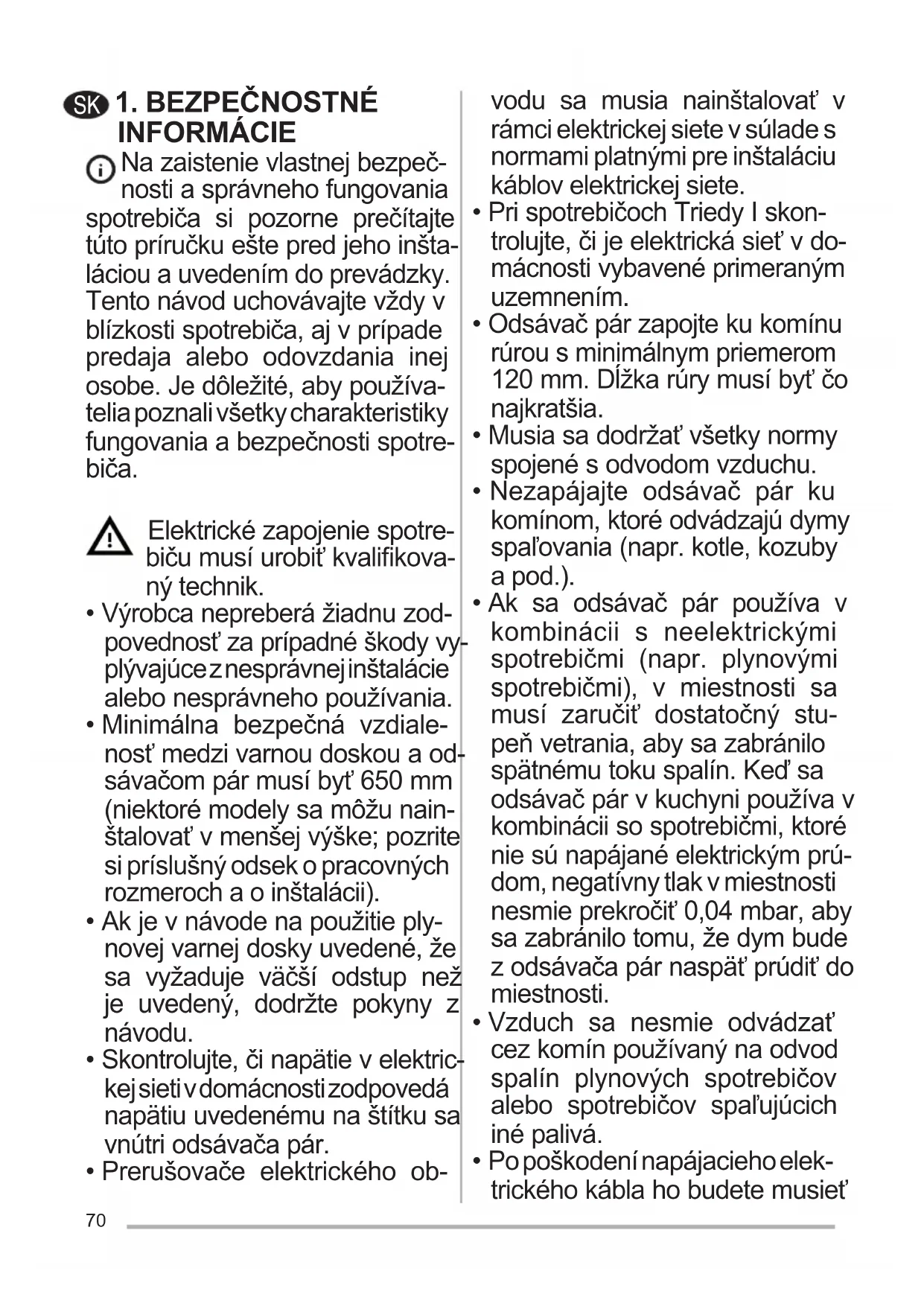 - Pokiaľ sa odsávač pár používa súčasne so spotrebičmi spa- ľujúcimi plyn alebo iné palivá, musí sa zaistiť vhodné vetranie miestnosti (neplatí pre spotrebi- če, ktoré odvádzajú iba vzduch v miestnosti).