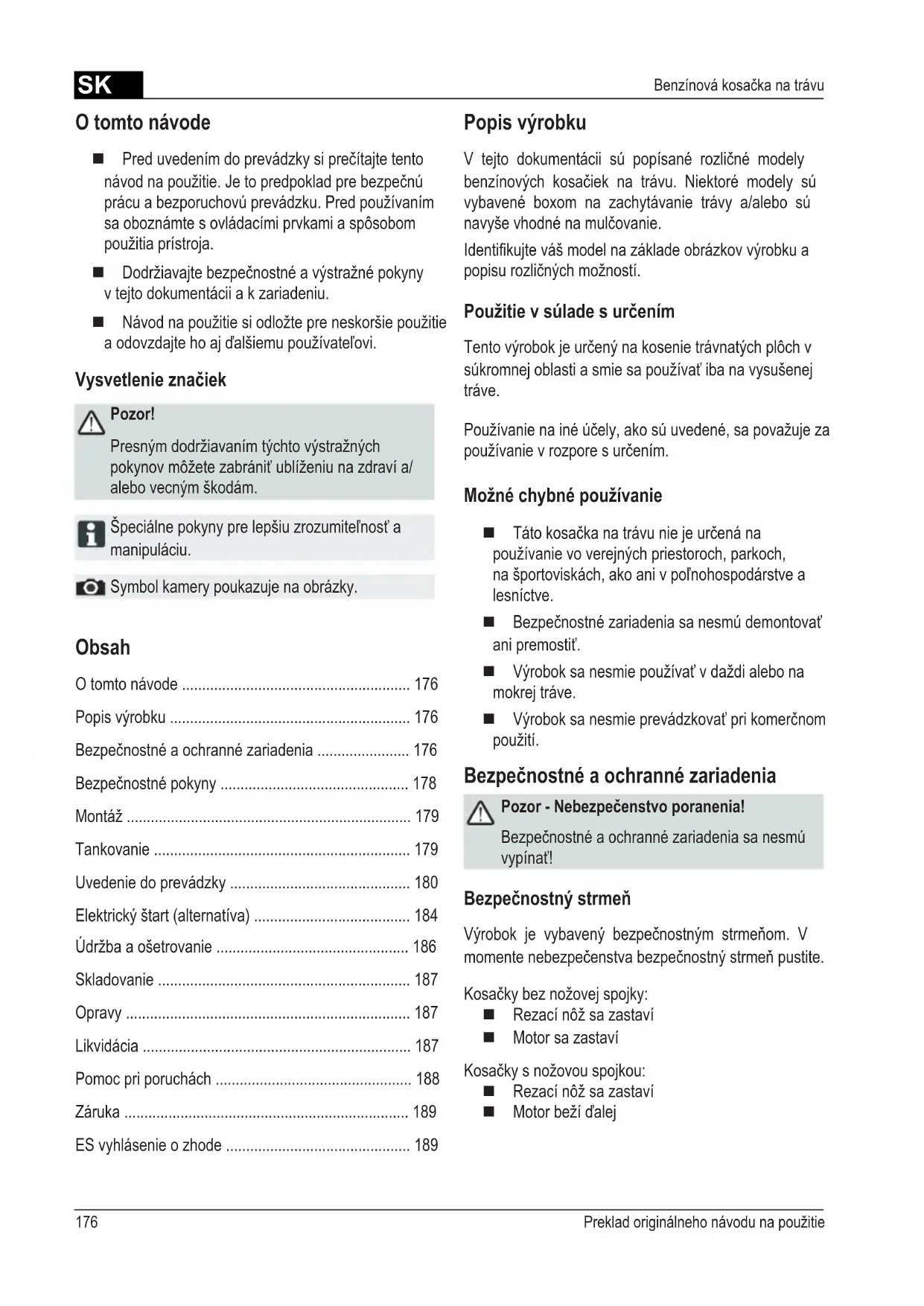 - Benzínová kosačka na trávu Obsah O tomto návode p. 176