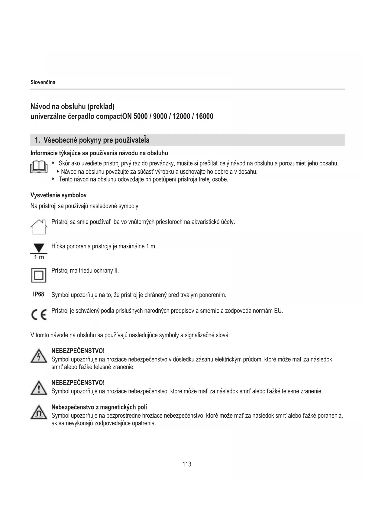 Informácie týkajúce sa používania návodu na obsluhu ▶ Skôr ako uvediete prístroj prvý raz do prevádzky, musíte si prečítať celý návod na obsluhu a porozumieť jeho obsahu. ▶ Návod na obsluhu považujte za súčasť výrobku a uschovajte ho dobre a v dosahu. ▶ Tento návod na obsluhu odovzdajte pri postúpení prístroja tretej osobe. Vysvetlenie symbolov Na prístroji sa používajú nasledovné symboly: Prístroj sa smie používať iba vo vnútorných priestoroch na akvaristické účely. Hĺbka ponorenia prístroja je maximálne 1 m. Prístroj má triedu ochrany II. Symbol upozorňuje na to, že prístroj je chránený pred trvalým ponorením. Prístroj je schválený podľa príslušných národných predpisov a smerníc a zodpovedá normám EU. V tomto návode na obsluhu sa používajú nasledujúce symboly a signalizačné slová: NEBEZPEČENSTVO! Symbol upozorňuje na hroziace nebezpečenstvo v dôsledku zásahu elektrickým prúdom, ktoré môže mať za následok smrť alebo ťažké telesné zranenie. NEBEZPEČENSTVO! Symbol upozorňuje na hroziace nebezpečenstvo, ktoré môže mať za následok smrť alebo ťažké telesné zranenie. Nebezpečenstvo z magnetických polí Symbol upozorňuje na bezprostredne hroziace nebezpečenstvo, ktoré môže mať za následok smrť alebo ťažké poranenia, ak sa nevykonajú zodpovedajúce opatrenia. IP68114 Slovenčina VAROVANIE! Symbol upozorňuje na hroziace nebezpečenstvo, ktoré môže mať za následok stredné až ľahké telesné zranenia alebo zdravotné riziko. POZOR! Symbol upozorňuje na nebezpečenstvo vecných škôd. Upozornenie s užitočnými informáciami a tipmi.