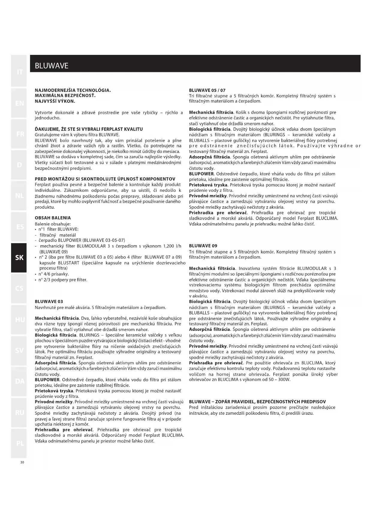 Ferplast poskytuje zaruku na filter BLUWAVE acos aj vsetky jeho diely a prisluensstvo acos je stanovené v toto odsek podla v sucasnosti platnych pravnych predipisov. Zaruka sa vztahuje len na vyrobné chyby a poskytnutie bezplatnej opravy alebo vymeny. Zaruka sa nevztahuje na poskodenie a/alebo vady sposobene nedbalostou, opotrebovanim, použivanim v rozpore s polymni a upozoreniami v tejo piručke, urazmi, nevhodnou manipulaciou, nesprávnym použivanim, neodbornymi opravami a nakupom, ktorý nie je podlozený dokladom. Na ziarivky,steller (ak je sučastou), spongie a filtracné materialy sa zaruka nevztahuje.