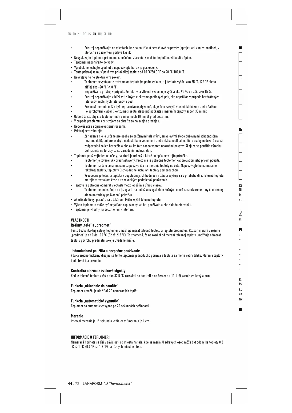 - Teplomer vždy chráňte pred zdrojmi tepla, ako sú pec, radiátory atď.44 / 72 LANAFORM “IR Thermometer” EN FR NL DE CS SK HU SL HR