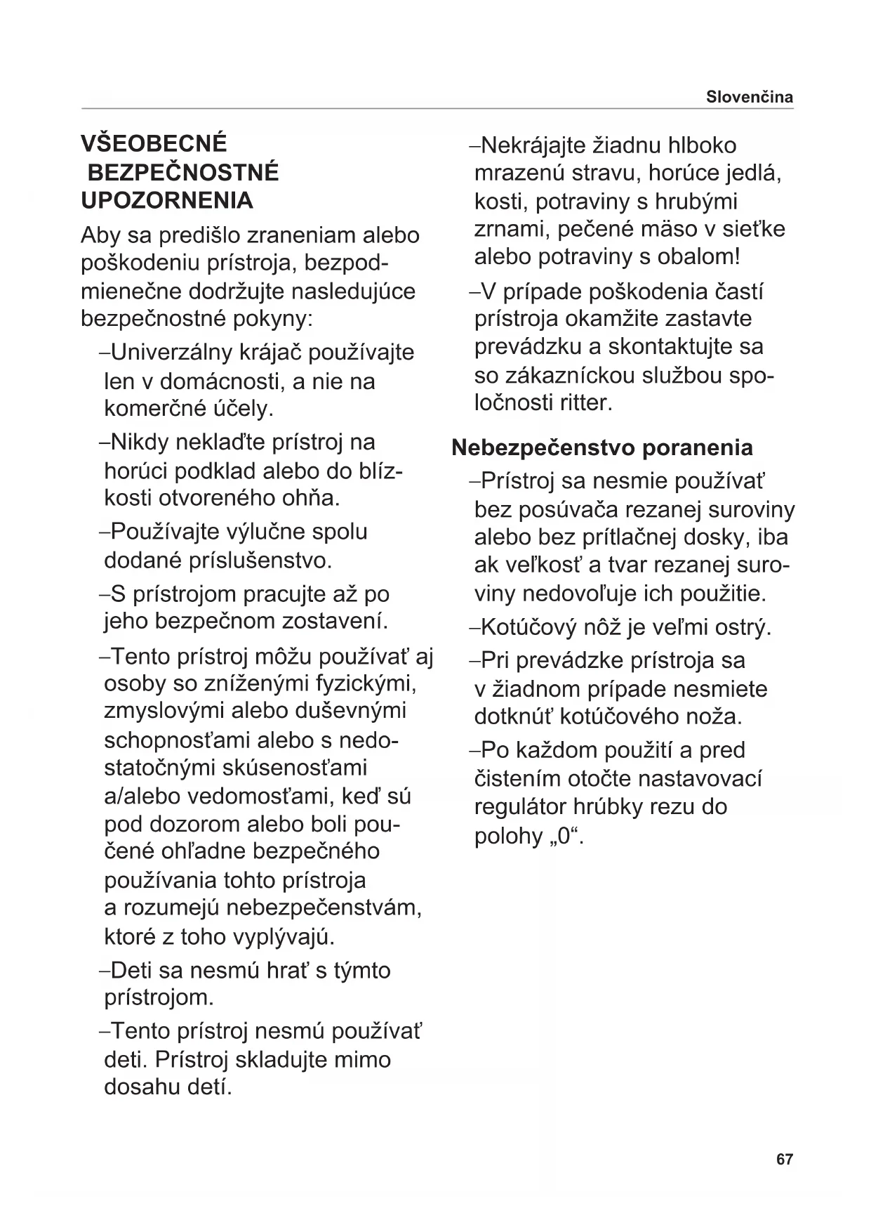 В случае гарантийных претен- зий или потребности в услугах сервисной службы необходимо в обязательном порядке отпра- вить универсальное режущее устройство в сервисную службу в соответствующей стране. ПОЯСНЕНИЯ К СИМВОЛАМ Символ Пояснение Маркировка CE: данное изделие соответствует действующим требованиям Европейского союза. Данное изделие выведено на рынок после 13 августа 2005 г. Его запрещается утилизировать вместе с обычным бытовым мусором. Символ с зачеркнутым мусорным контейнером указывает на необходимость раздельного сбора. Подходит для контакта с пищевыми продуктами67 VŠEOBECNÉ BEZPEČNOSTNÉ UPOZORNENIA Aby sa predišlo zraneniam alebo poškodeniu prístroja, bezpod- mienečne dodržujte nasledujúce bezpečnostné pokyny: – Univerzálny krájač používajte len v domácnosti, a nie na komerčné účely. – Nikdy neklaďte prístroj na horúci podklad alebo do blíz- kosti otvoreného ohňa. – Používajte výlučne spolu dodané príslušenstvo. – S prístrojom pracujte až po jeho bezpečnom zostavení. – Tento prístroj môžu používať aj osoby so zníženými fyzickými, zmyslovými alebo duševnými schopnosťami alebo s nedo- statočnými skúsenosťami a/alebo vedomosťami, keď sú pod dozorom alebo boli pou- čené ohľadne bezpečného používania tohto prístroja a rozumejú nebezpečenstvám, ktoré z toho vyplývajú. – Deti sa nesmú hrať s týmto prístrojom. – Tento prístroj nesmú používať deti. Prístroj skladujte mimo dosahu detí. – Nekrájajte žiadnu hlboko mrazenú stravu, horúce jedlá, kosti, potraviny s hrubými zrnami, pečené mäso v sieťke alebo potraviny s obalom! – V prípade poškodenia častí prístroja okamžite zastavte prevádzku a skontaktujte sa so zákazníckou službou spo- ločnosti ritter. Nebezpečenstvo poranenia – Prístroj sa nesmie používať bez posúvača rezanej suroviny alebo bez prítlačnej dosky, iba ak veľkosť a tvar rezanej suro- viny nedovoľuje ich použitie. – Kotúčový nôž je veľmi ostrý. – Pri prevádzke prístroja sa v žiadnom prípade nesmiete dotknúť kotúčového noža. – Po každom použití a pred čistením otočte nastavovací regulátor hrúbky rezu do polohy „0“. Slovenčina68 Vyklopte obrázky na prednej a zadnej obálke návodu. Pred uvedením prístroja do prevádzky si starostlivo prečítajte návod na obsluhu. Uschovajte si návod na obsluhu a v prípade odovzdania prístroja inej osobe ho priložte k prístroju. Alternatívne je k dispozícii aktu- álny návod na obsluhu na stránke www.ritterwerk.de.