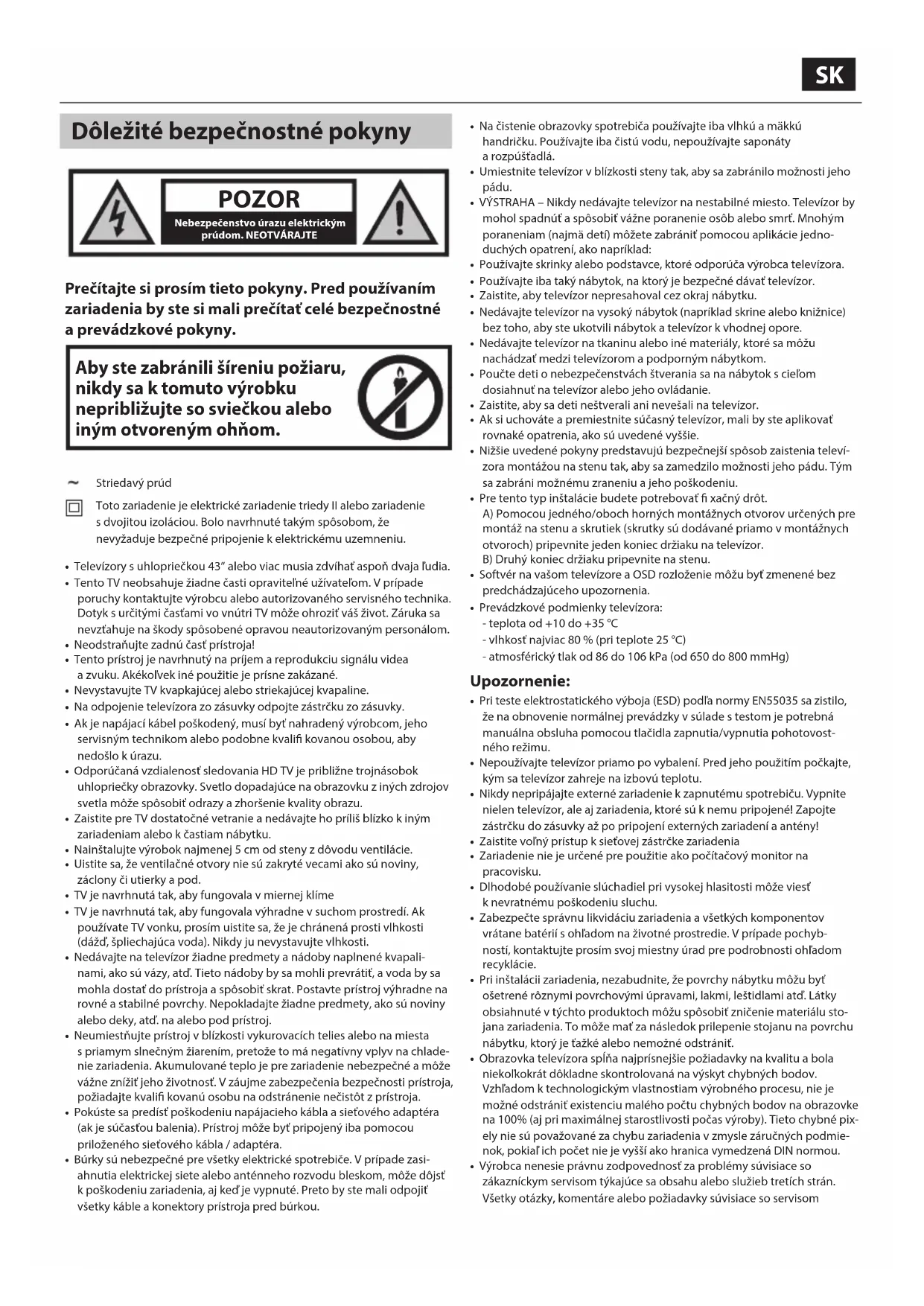 - TV je navrhnutá tak, aby fungovala výhradne vsuchom prostredí. Ak používate TV vonku, prosím uistite sa, že je chránená prosti vlhkosti (dážď, špliechajúca voda). Nikdy ju nevystavujte vlhkosti.