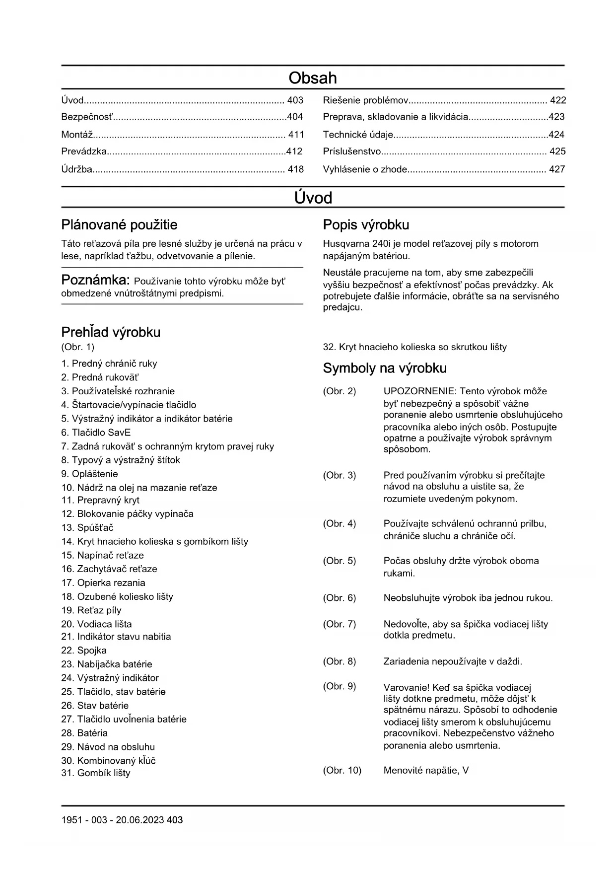 - Vyhlásenie o zhode Úvod Plánované použitie Táto reťazová píla pre lesné služby je určená na prácu v lese, napríklad ťažbu, odvetvovanie a pílenie. Poznámka: Používanie tohto výrobku môže byť obmedzené vnútroštátnymi predpismi. Popis výrobku Husqvarna 240i je model reťazovej píly s motorom napájaným batériou. Neustále pracujeme na tom, aby sme zabezpečili vyššiu bezpečnosť a efektívnosť počas prevádzky. Ak potrebujete ďalšie informácie, obráťte sa na servisného predajcu. Prehľad výrobku (Obr. 1) p. 427