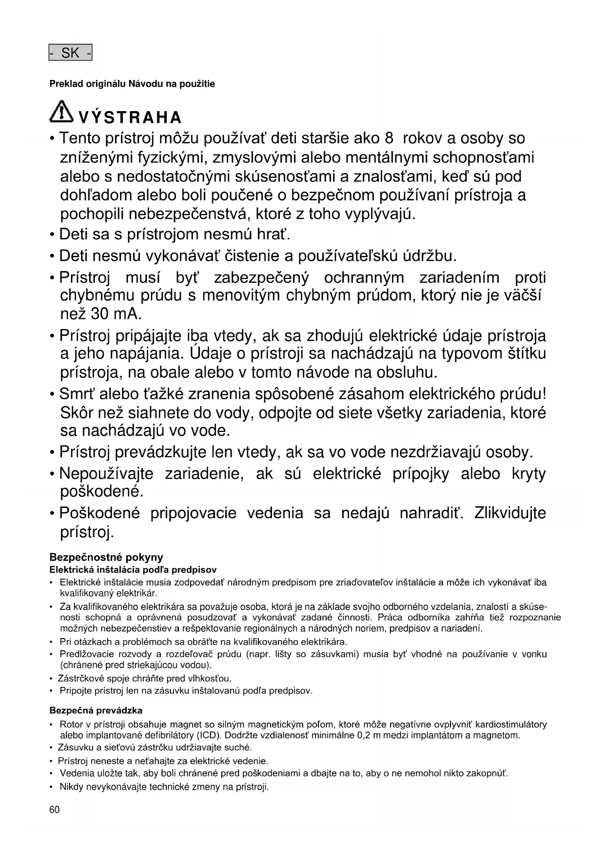 - Prístroj musí byť zabezpečený ochranným zariadením proti chybnému prúdu s menovitým chybným prúdom, ktorý nie je väčší než 30 mA.