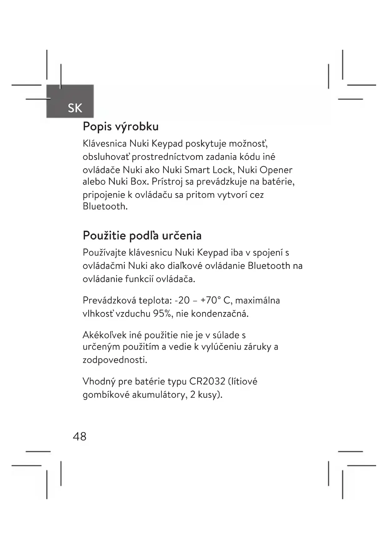 Popis výrobku Klávesnica Nuki Keypad poskytuje možnosť, obsluhovať prostredníctvom zadania kódu iné ovládače Nuki ako Nuki Smart Lock, Nuki Opener alebo Nuki Box. Prístroj sa prevádzkuje na batérie, pripojenie k ovládaču sa pritom vytvorí cez Bluetooth. Použitie podľa určenia Používajte klávesnicu Nuki Keypad iba v spojení s ovládačmi Nuki ako diaľkové ovládanie Bluetooth na ovládanie funkcií ovládača. Prevádzková teplota: -20 – +70° C, maximálna vlhkosť vzduchu 95%, nie kondenzačná. Akékoľvek iné použitie nie je v súlade s určeným použitím a vedie k vylúčeniu záruky a zodpovednosti. Vhodný pre batérie typu CR2032 (lítiové gombíkové akumulátory, 2 kusy).49