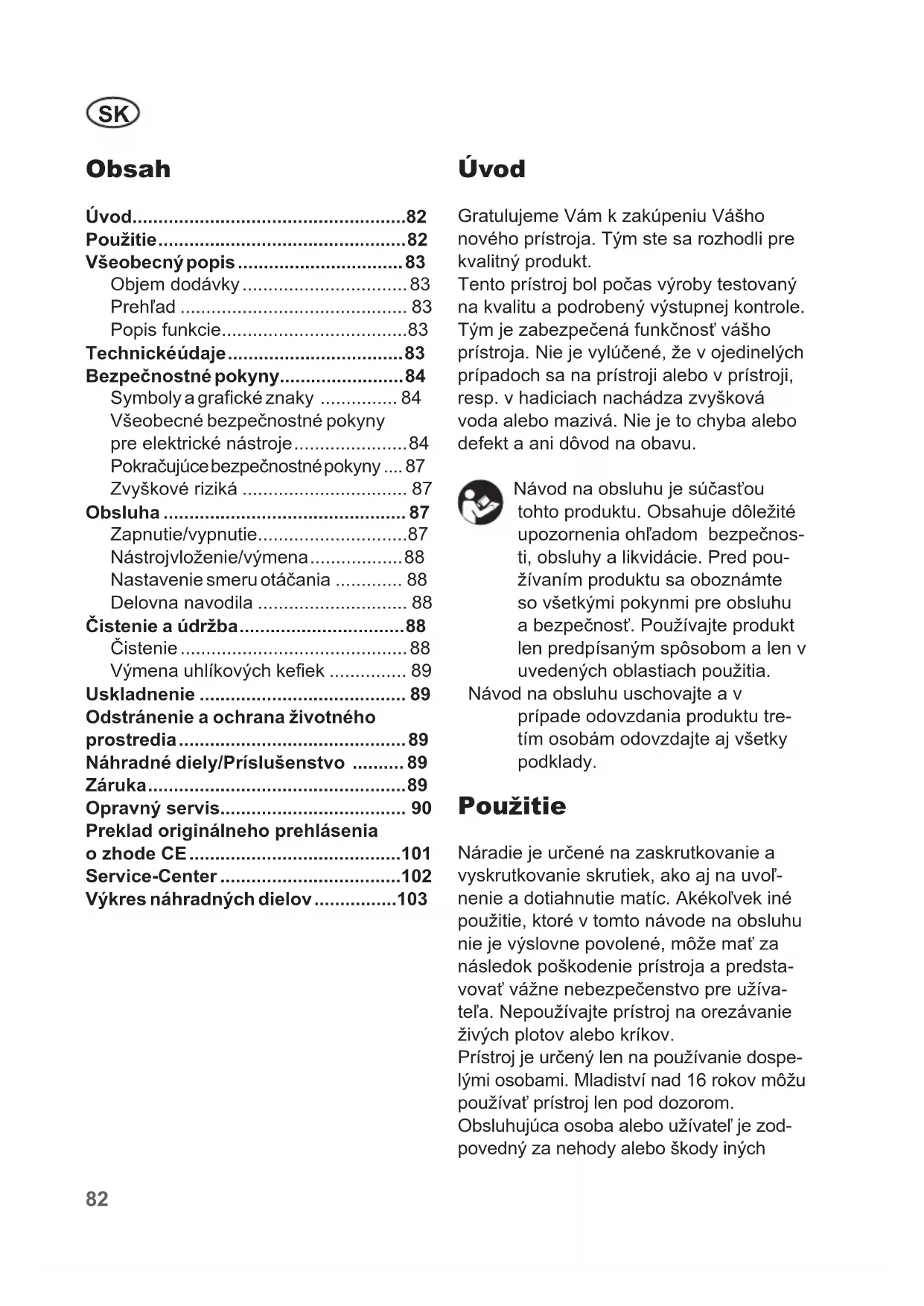 - Úvod Gratulujeme Vám k zakúpeniu Vášho nového prístroja. Tým ste sa rozhodli pre kvalitný produkt. Tento prístroj bol počas výroby testovaný na kvalitu a podrobený výstupnej kontrole. Tým je zabezpečená funkčnosť vášho prístroja. Nie je vylúčené, že v ojedinelých prípadoch sa na prístroji alebo v prístroji, resp. v hadiciach nachádza zvyšková voda alebo mazivá. Nie je to chyba alebo defekt a ani dôvod na obavu. Návod na obsluhu je súčasťou tohto produktu. Obsahuje dôležité upozornenia ohľadom bezpečnos- ti, obsluhy a likvidácie. Pred pou- žívaním produktu sa oboznámte so všetkými pokynmi pre obsluhu a bezpečnosť. Používajte produkt len predpísaným spôsobom a len v uvedených oblastiach použitia. Návod na obsluhu uschovajte a v prípade odovzdania produktu tre- tím osobám odovzdajte aj všetky podklady. Použitie Náradie je určené na zaskrutkovanie a vyskrutkovanie skrutiek, ako aj na uvoľ- nenie a dotiahnutie matíc. Akékoľvek iné použitie, ktoré v tomto návode na obsluhu nie je výslovne povolené, môže mať za následok poškodenie prístroja a predsta- vovať vážne nebezpečenstvo pre užíva- teľa. Nepoužívajte prístroj na orezávanie živých plotov alebo kríkov. Prístroj je určený len na používanie dospe- lými osobami. Mladiství nad 16 rokov môžu používať prístroj len pod dozorom. Obsluhujúca osoba alebo užívateľ je zod- povedný za nehody alebo škody iných Preklad originálneho prehlásenia o zhode CE p. 101