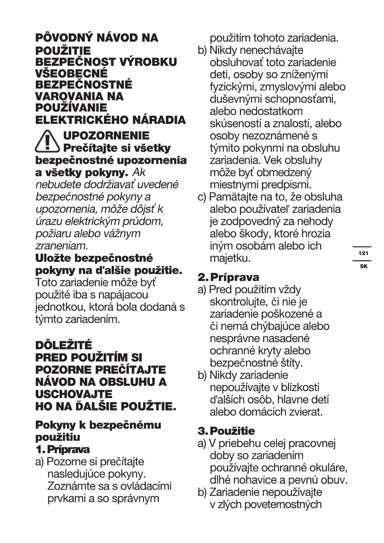 a) Pozorne si prečítajte nasledujúce pokyny. Zoznámte sa s ovládacími prvkami a so správnym použitím tohoto zariadenia. b) Nikdy nenechávajte obsluhovať toto zariadenie deti, osoby so zníženými fyzickými, zmyslovými alebo duševnými schopnosťami, alebo nedostatkom skúseností a znalostí, alebo osoby nezoznámené s týmito pokynmi na obsluhu zariadenia. Vek obsluhy môže byť obmedzený miestnymi predpismi. c) Pamätajte na to, že obsluha alebo používateľ zariadenia je zodpovedný za nehody alebo škody, ktoré hrozia iným osobám alebo ich majetku.
