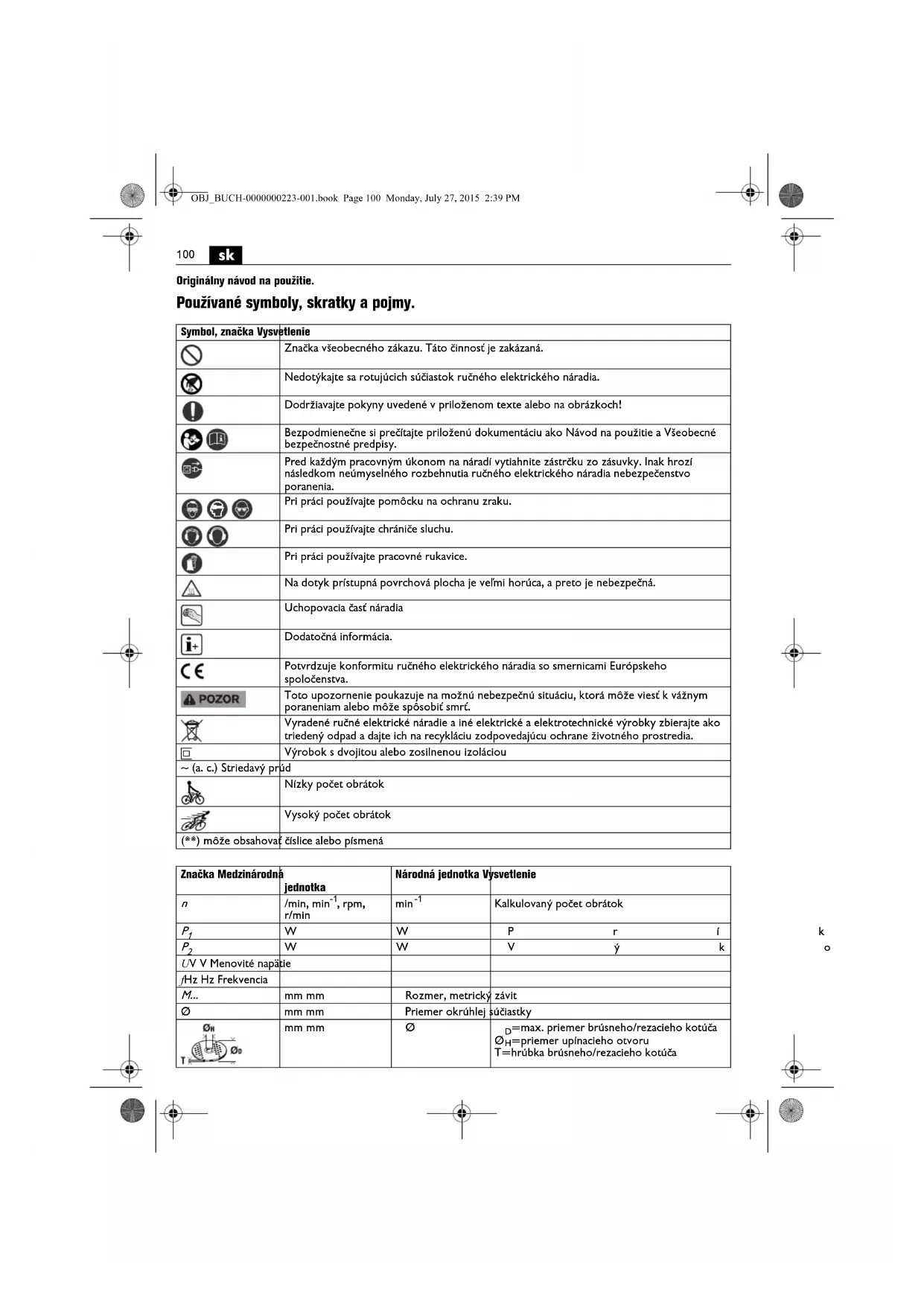Originálny návod na použitie. Používané symboly, skratky a pojmy. Symbol, značka Vysvetlenie Značka všeobecného zákazu. Táto činnosť je zakázaná. Nedotýkajte sa rotujúcich súčiastok ručného elektrického náradia. Dodržiavajte pokyny uvedené v priloženom texte alebo na obrázkoch! Bezpodmienečne si prečítajte priloženú dokumentáciu ako Návod na použitie a Všeobecné bezpečnostné predpisy. Pred každým pracovným úkonom na náradí vytiahnite zástrčku zo zásuvky. Inak hrozí následkom neúmyselného rozbehnutia ručného elektrického náradia nebezpečenstvo poranenia. Pri práci používajte pomôcku na ochranu zraku. Pri práci používajte chrániče sluchu. Pri práci používajte pracovné rukavice. Na dotyk prístupná povrchová plocha je veľmi horúca, a preto je nebezpečná. Uchopovacia časť náradia Dodatočná informácia. Potvrdzuje konformitu ručného elektrického náradia so smernicami Európskeho spoločenstva. Toto upozornenie poukazuje na možnú nebezpečnú situáciu, ktorá môže viesť k vážnym poraneniam alebo môže spôsobiť smrť. Vyradené ručné elektrické náradie a iné elektrické a elektrotechnické výrobky zbierajte ako triedený odpad a dajte ich na recykláciu zodpovedajúcu ochrane životného prostredia. Výrobok s dvojitou alebo zosilnenou izoláciou ~ (a. c.) Striedavý prúd Nízky počet obrátok Vysoký počet obrátok (**) môže obsahovať číslice alebo písmená Značka Medzinárodná jednotka Národná jednotka Vysvetlenie
