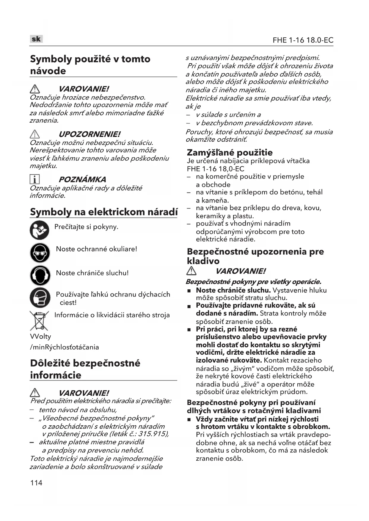 Symboly použité vtomto návode VAROVANIE! Označuje hroziace nebezpečenstvo. Nedodržanie tohto upozornenia môže mať za následok smrť alebo mimoriadne ťažké zranenia. UPOZORNENIE! Označuje možnú nebezpečnú situáciu. Nerešpektovanie tohto varovania môže viesť kľahkému zraneniu alebo poškodeniu majetku. POZNÁMKA Označuje aplikačné rady adôležité informácie. Symboly na elektrickom náradí Prečítajte si pokyny. Noste ochranné okuliare! Noste chrániče sluchu! Používajte ľahkú ochranu dýchacích ciest! Informácie olikvidácii starého stroja V Volty /min Rýchlosť otáčania Dôležité bezpečnostné informácie VAROVANIE! Pred použitím elektrického náradia si prečítajte: tento návod na obsluhu, „Všeobecné bezpečnostné pokyny“ ozaobchádzaní selektrickým náradím vpriloženej príručke (leták č.: 315.915), aktuálne platné miestne pravidlá apredpisy na prevenciu nehôd. Toto elektrický náradie je najmodernejšie zariadenie abolo skonštruované vsúlade suznávanými bezpečnostnými predpismi. Pri použití však môže dôjsť kohrozeniu života akončatín používateľa alebo ďalších osôb, alebo môže dôjsť kpoškodeniu elektrického náradia či iného majetku. Elektrické náradie sa smie používať iba vtedy, ak je vsúlade surčením a vbezchybnom prevádzkovom stave. Poruchy, ktoré ohrozujú bezpečnosť, sa musia okamžite odstrániť. Zamýšľané použitie Je určená nabíjacia príklepová vŕtačka FHE 1-16 18,0-EC